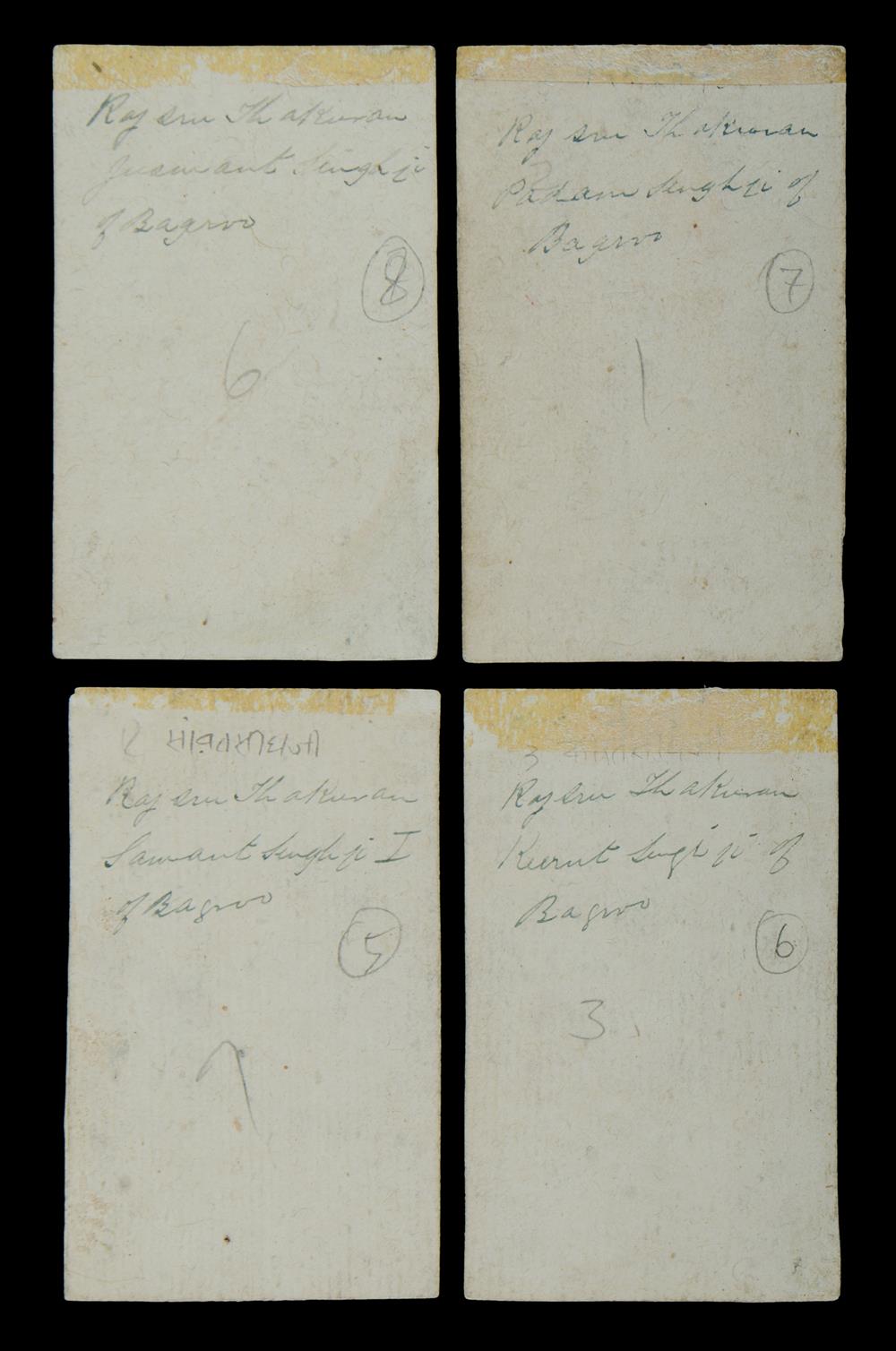 8 Portraits of Indian Emperors. 7 inscribed verso as representing personages from Bagroo (Bagru, Rajasthan) Gouache, Ink & Gilt on Card (8) 11x6cm (each) Estimate $500-700