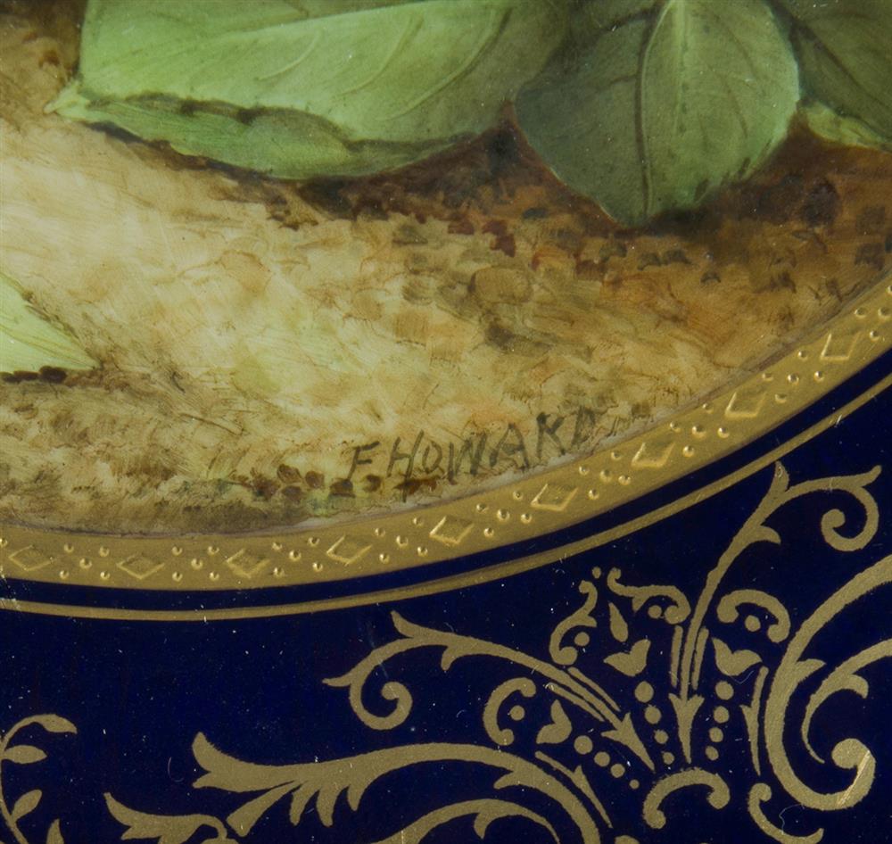 Set 15 Coalport Hand Painted Cabinet Plates. Each signed 'F Howard' & painted with roses. Floral gilt & cobalt borders. One restored, five with hairline cracks. Dia 23cm (each) Estimate $500-1,000