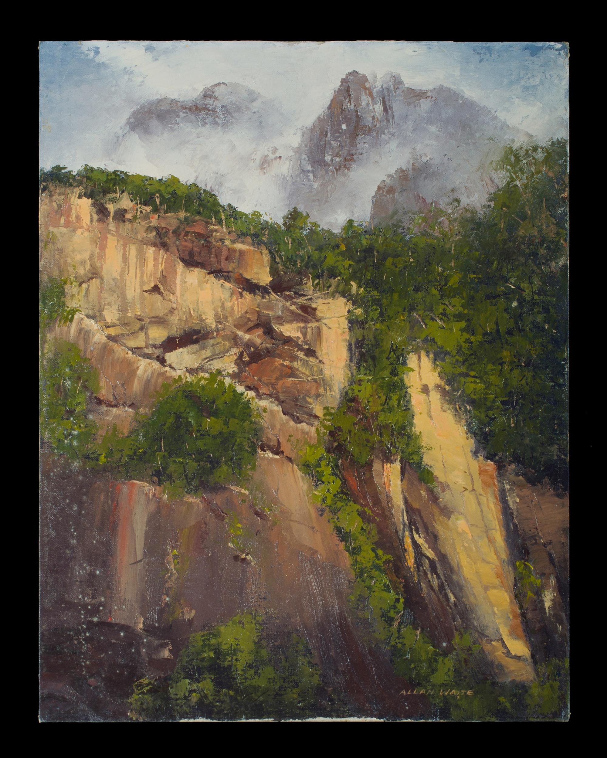 WAITE, Allan (1924-2010) (2) 'Beech Forest - Haast Pass NZ' (Near Thundering Creek) (36x46cm); & 'The Walls of Mitre Peak,' Milford Sound, NZ (46x35cm). Oil on Canvas Board (2)Estimate $100-200