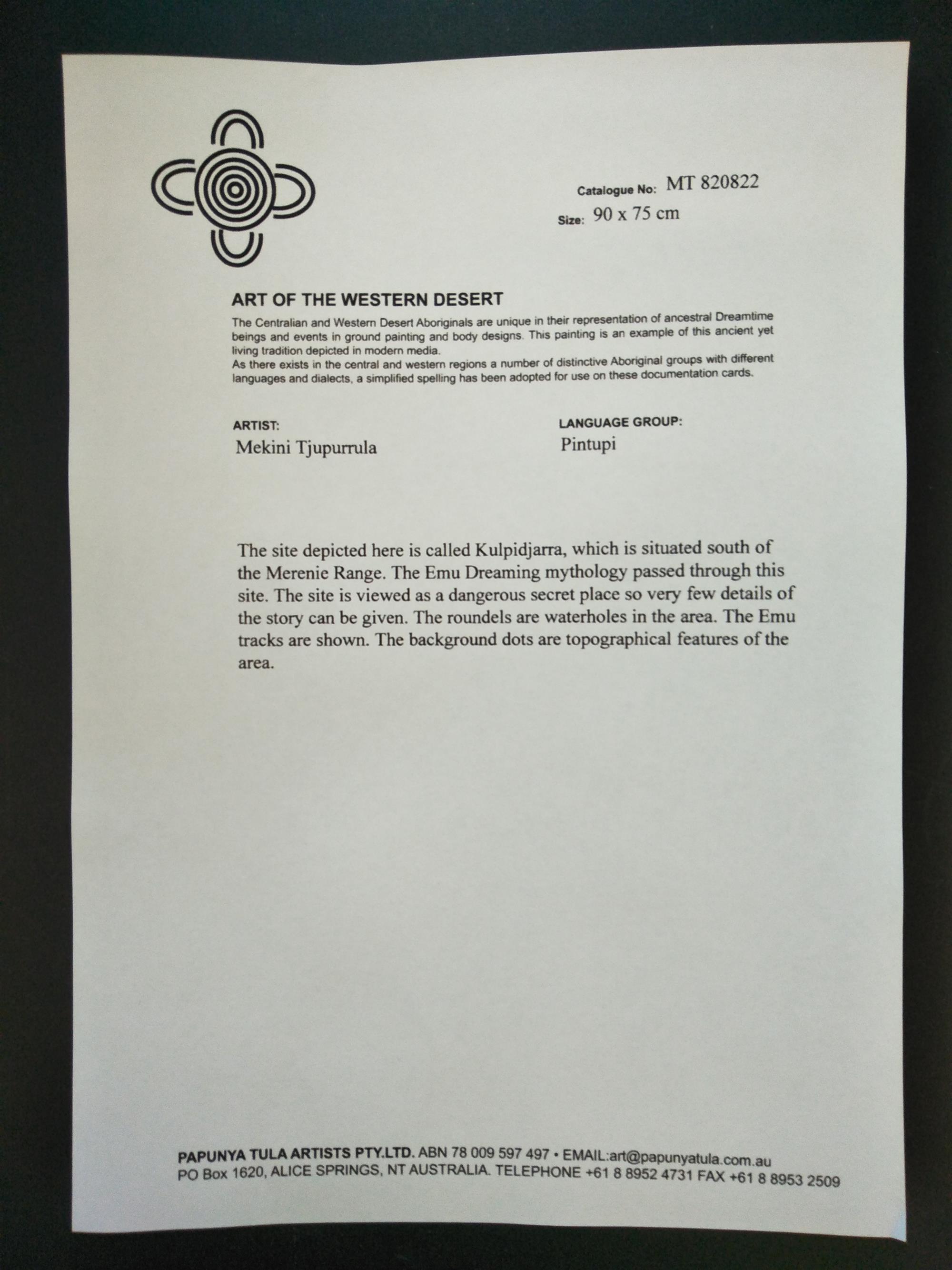 TJUPURRULA, Mekini (Aboriginal born c1932) Untitled, 1982. Acrylic on Linen 90.5x75cm PROVENANCE: Papunya Tula Artists cat #MT820822. Certificate of authenticity included.Estimate $400-700