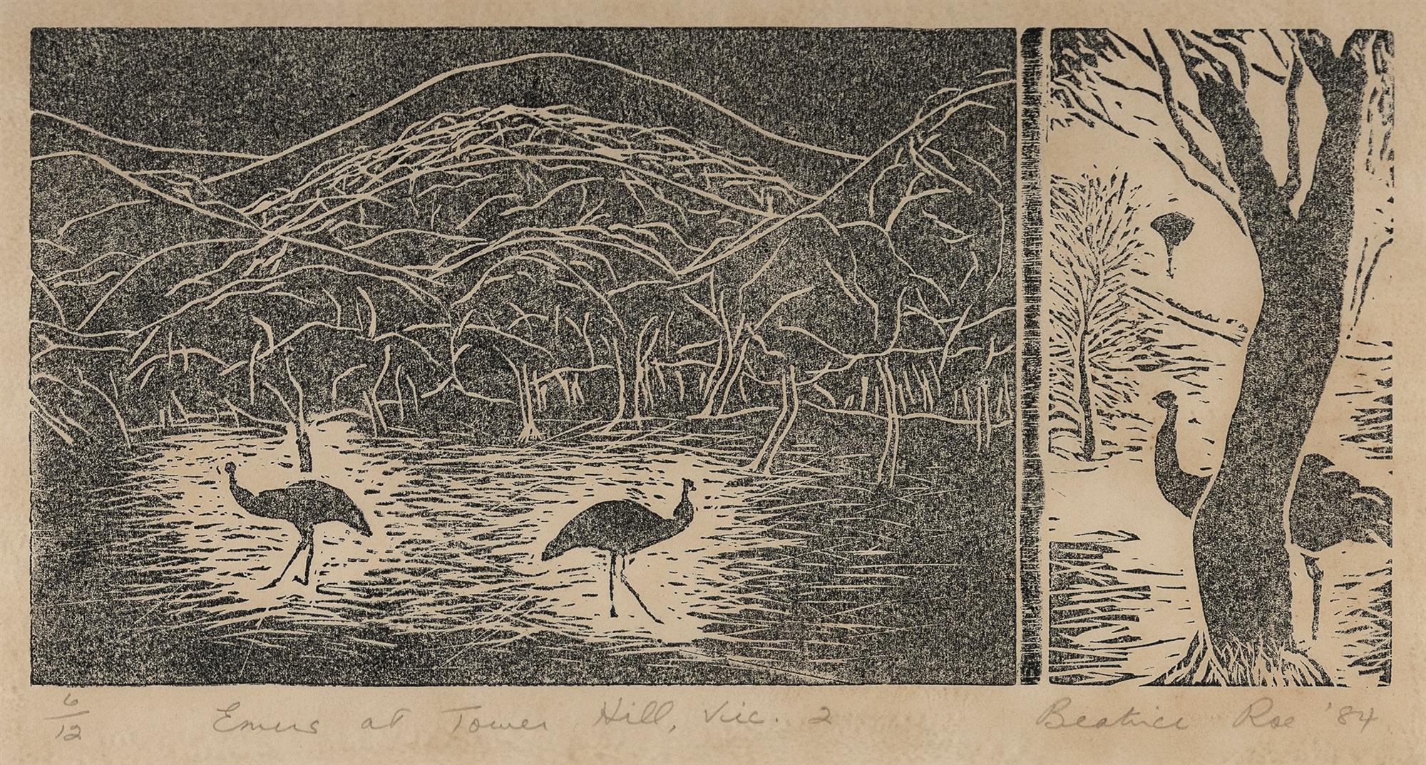 ROE, Beatrice (1920-2019) (3) 'Emus at Tower Hill, Victoria,' 1984, ed 1/6 (15x22cm); 'Emus at Tower Hill, Vic. 2,' 1984, ed. 6/12 (15x30.5cm); & 'Still-life with Napkin,' 1987, ed. 4/8 (7x30cm). Linocut (3)Estimate $60-120