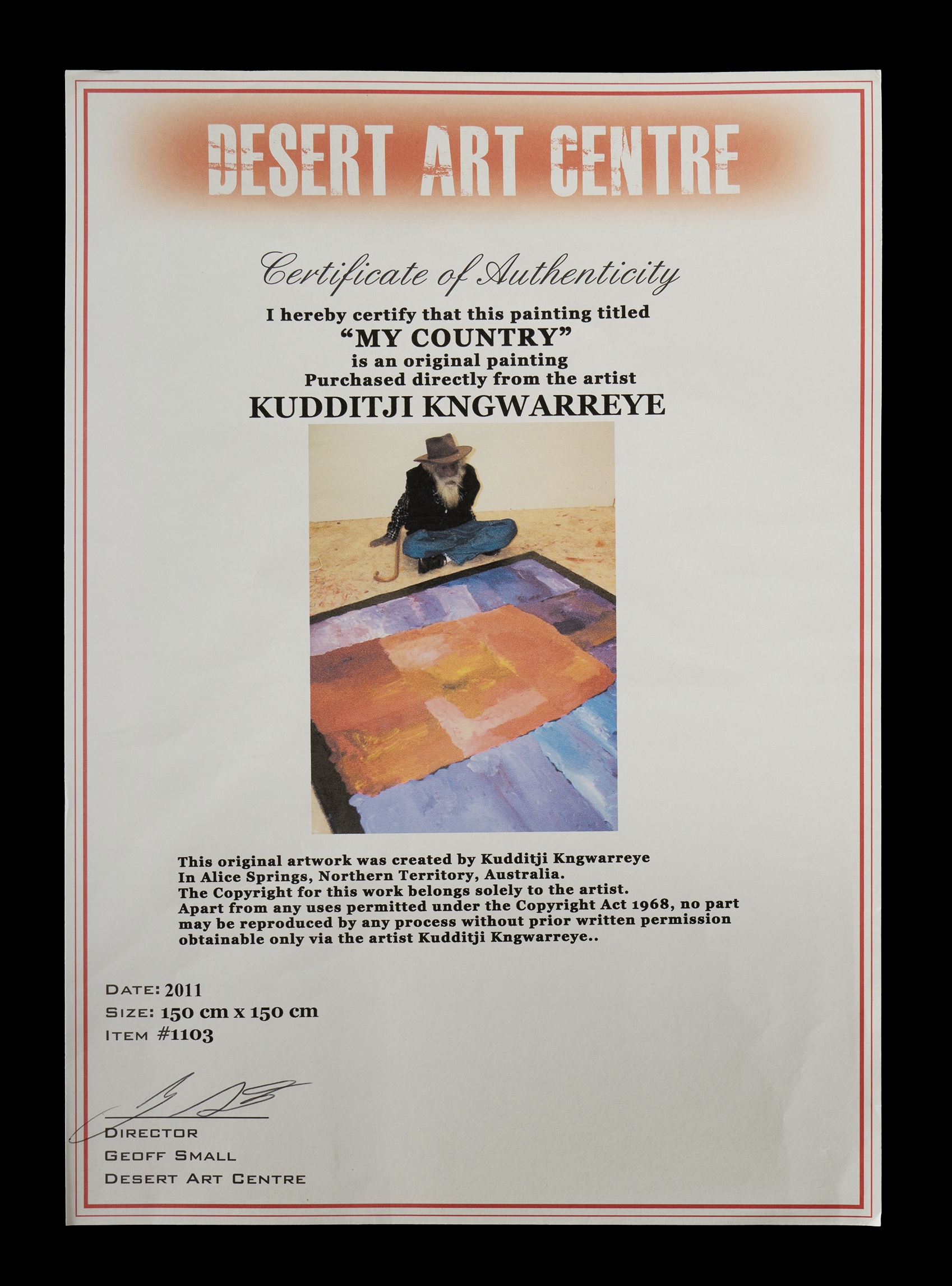 KNGWARREYE, Kudditji (Aboriginal c1938-2017) 'My Country,' 2011. Signed 'Kudditji' verso. Provenance: Desert Art Centre, cat #1103 (certificate of authenticity included); private collection, NSW. Acrylic on Canvas 151x151cmEstimate $2,500-4,500