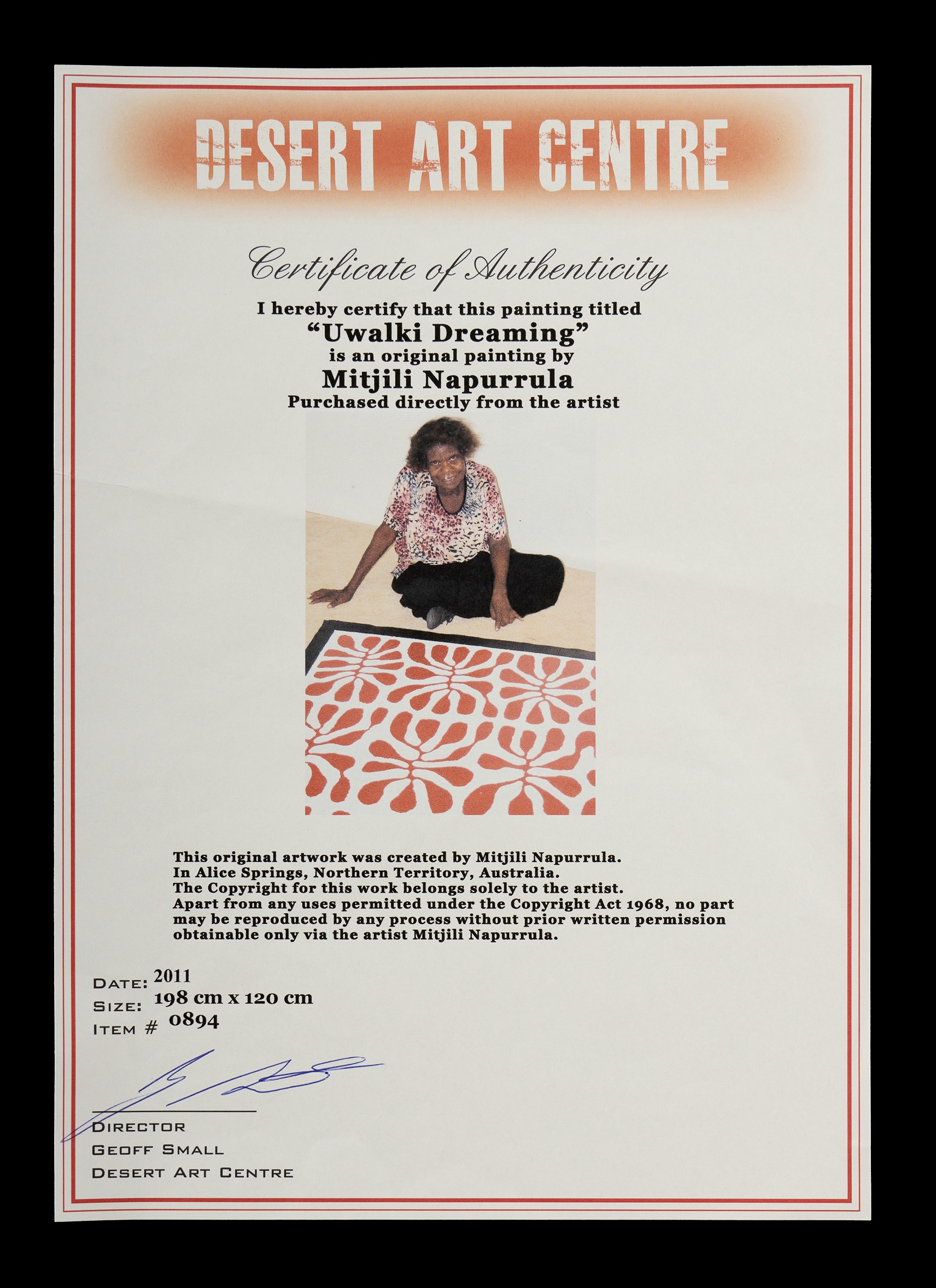NAPURRULA, Mitjili (Aboriginal born c.1949) 'Uwalki Dreaming,' 2011. Signed 'Mitjili' verso. Provenance: Desert Art Centre, cat #0894 (certificate of authenticity included); private collection, NSW. Acrylic on Linen 199x119cmEstimate $2,000-4,000