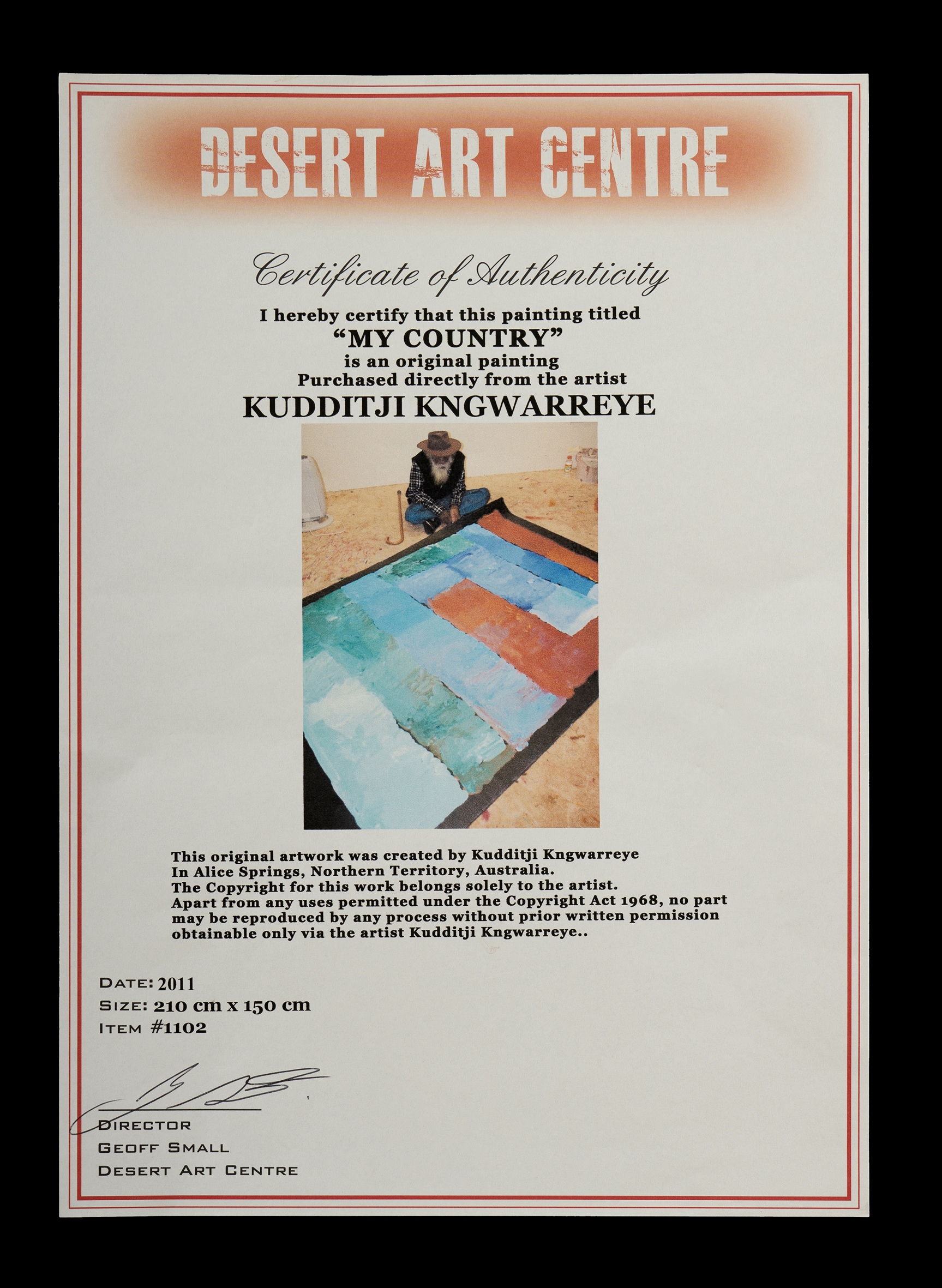 KNGWARREYE, Kudditji (Aboriginal c1938-2017) 'My Country,' 2011. Signed 'Kudditji' verso. Provenance: Desert Art Centre, cat #1102 (certificate of authenticity included); private collection, NSW. Acrylic on Linen 208x152cmEstimate $3,500-5,500