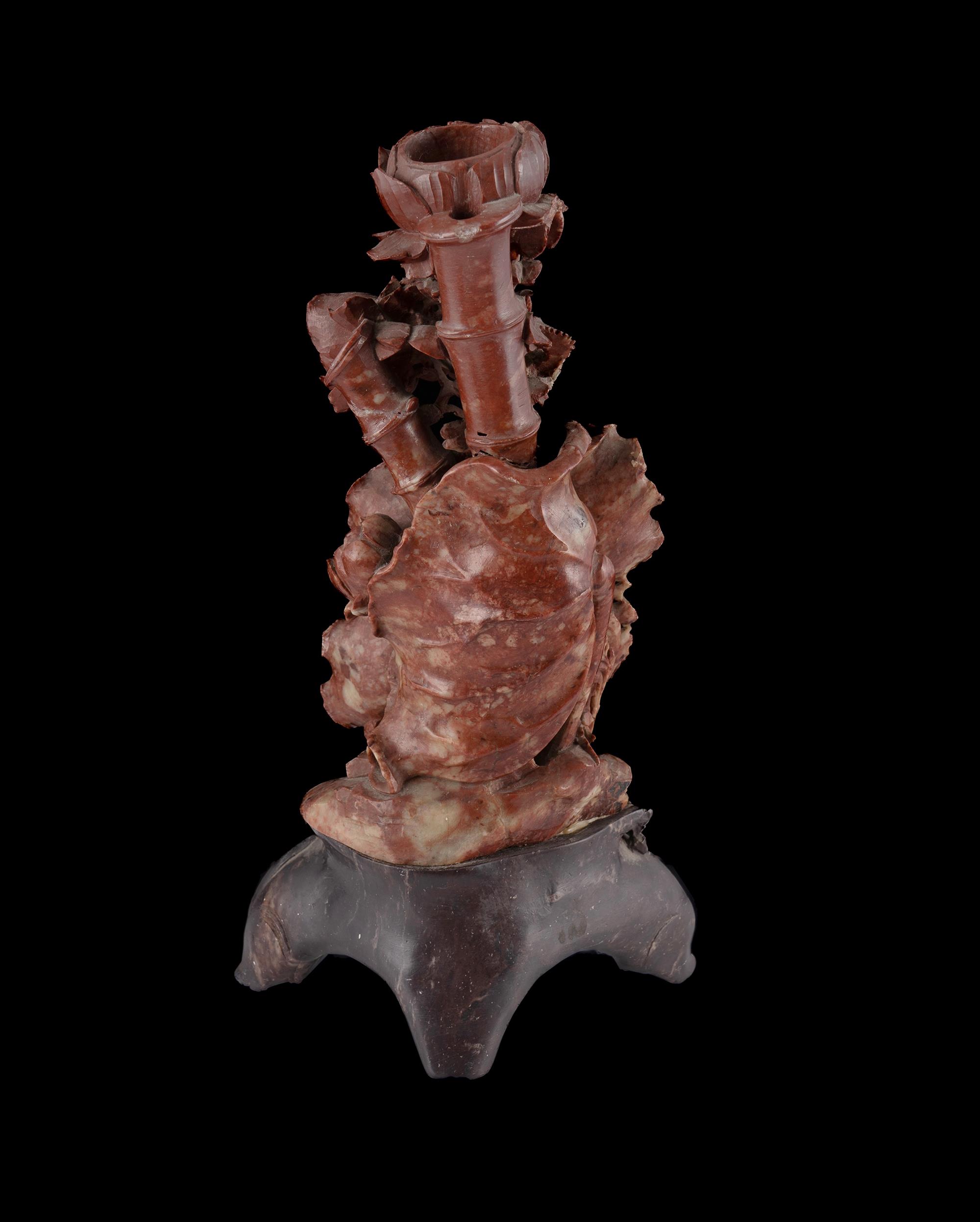 Two Chinese Soapstone Carvings Well carved candlestick, naturally carved with waterlilies (H31cm); & a flowering prunus tree in a pot (H19.5cm) Provenance: Deceased Estate, Sydney.Estimate $50-100
