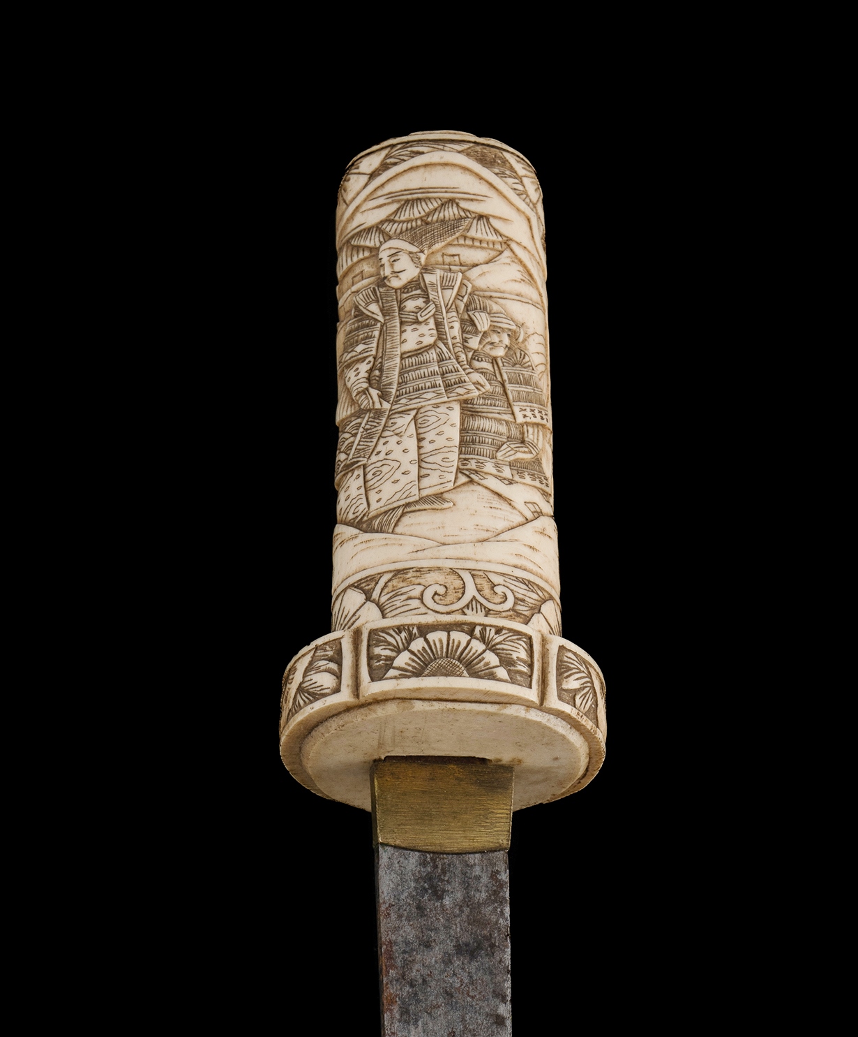 Japanese Late Meiji Period Bone Tanto Both scabbard and hilt well carved with low relief decoration of armoured Samurai. (L38cm)Estimate $150-300