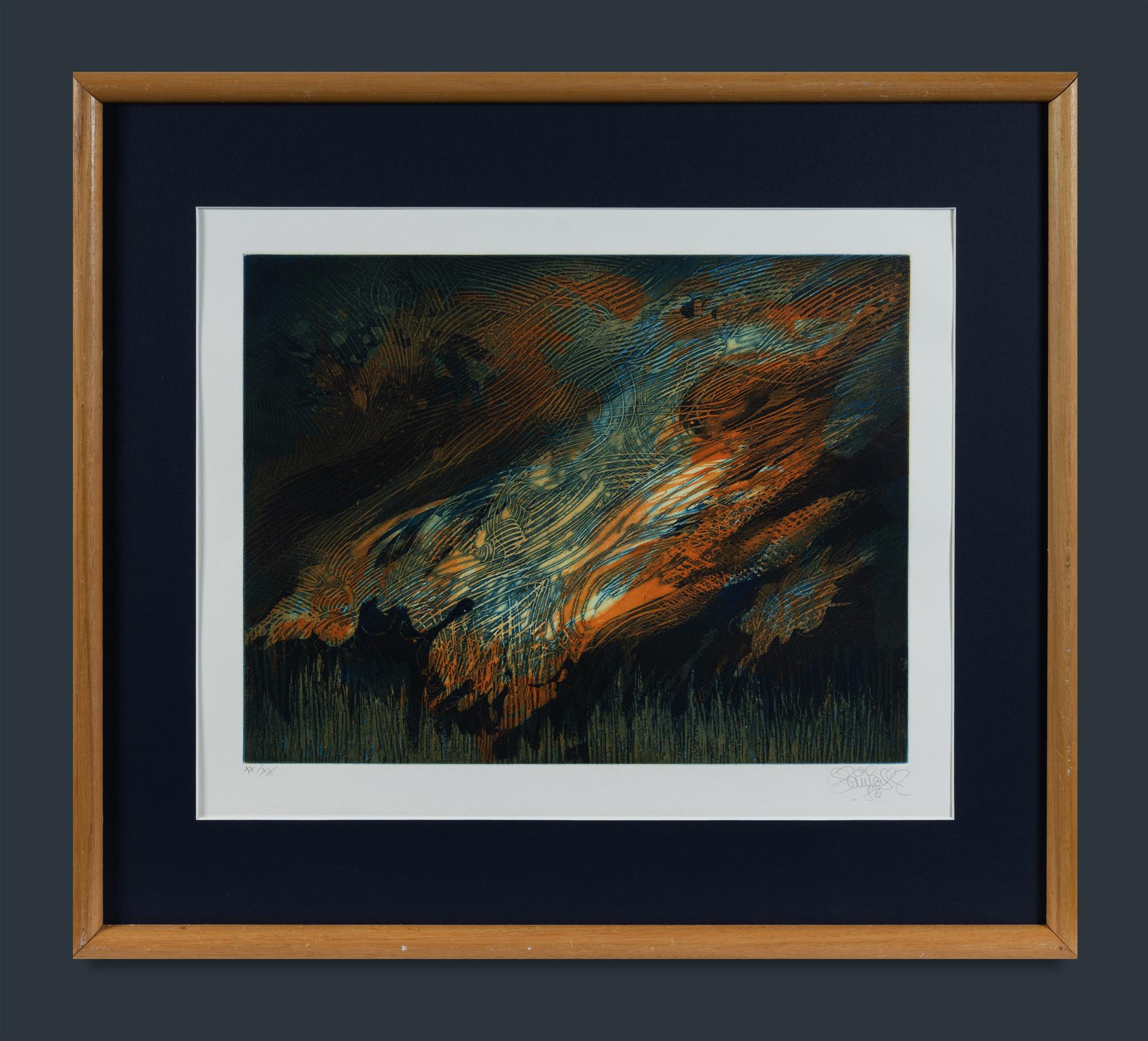 SCHMEISSER, Jorg (1942-2012) (2) 'Fire Column' (XVII/XX) and 'Fire Signal' (XX/XX), 1986. Colour Etching (2) 34x44cm approx. (plate) 58x66cm (frame)Estimate $400-700