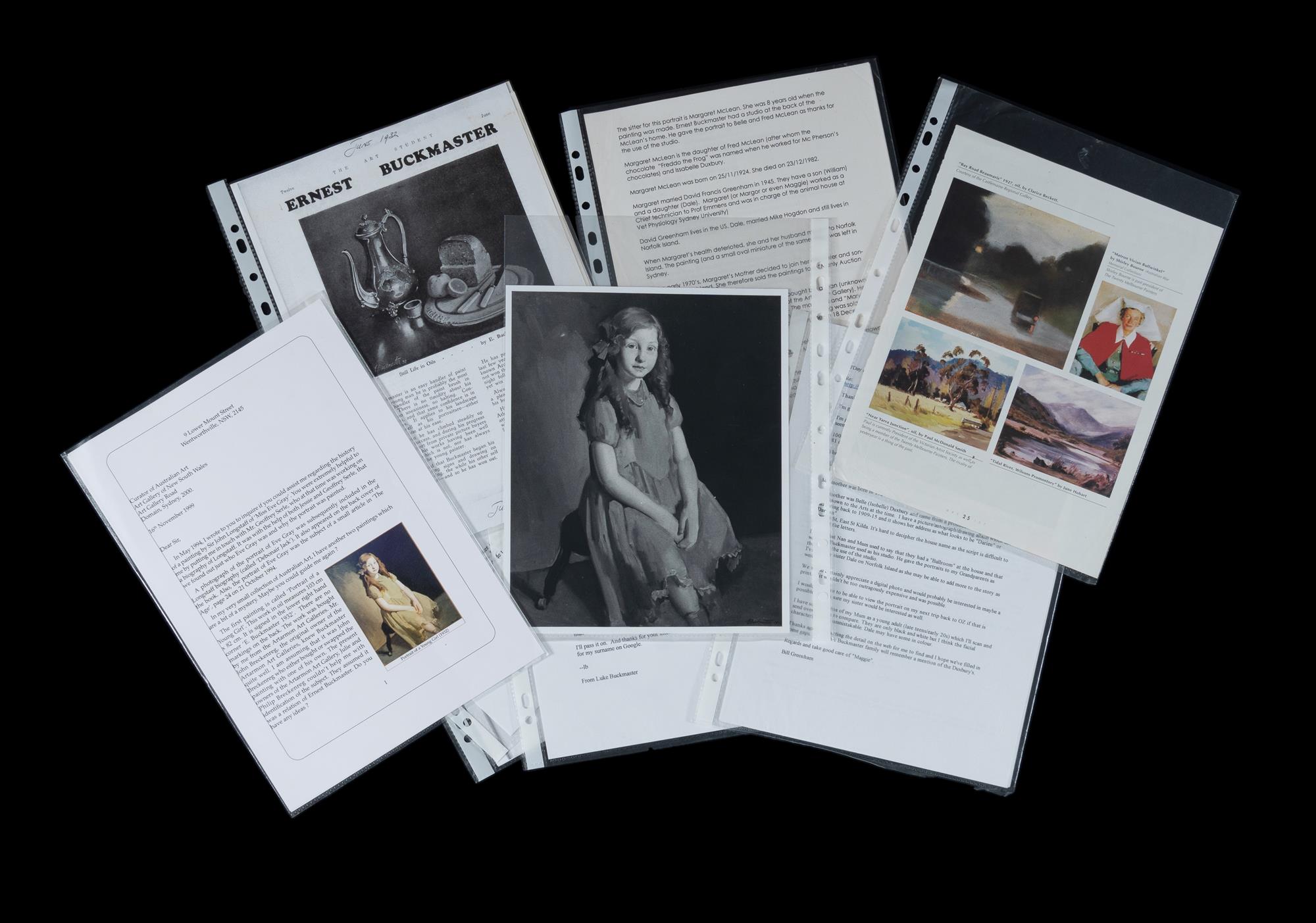 BUCKMASTER, Ernest (1897-1968) 'Portrait of a Young Girl - Maggie McLean, Aged 8,' 1932. Artarmon Galleries, Sydney, label verso (#18519). Accompanied by a folder with documentation and research material relating to the painting, artist and sitter. Oil on Canvas 101x80.5cm Estimate $2,000-4,000