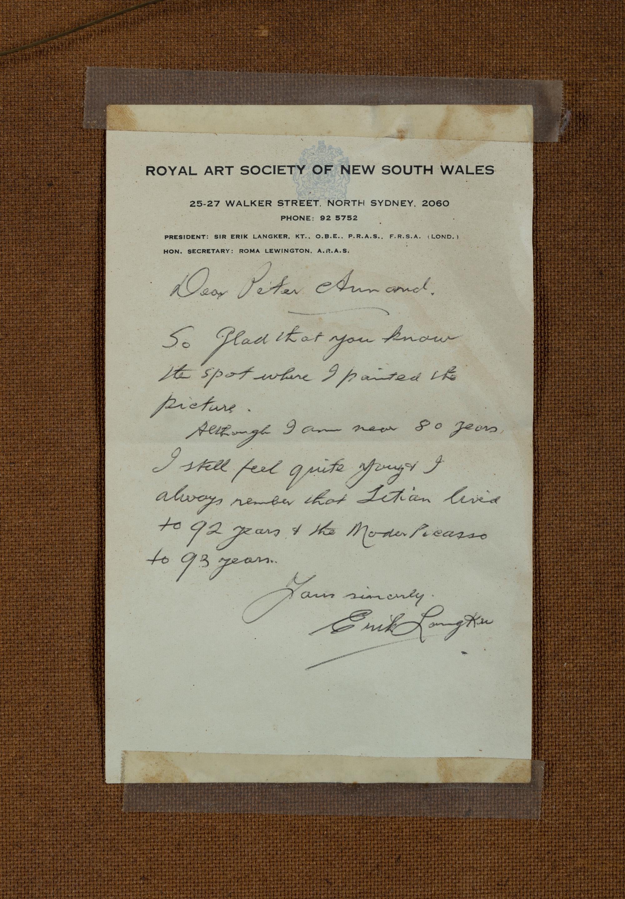 LANGKER, Erik (1898-1982) 'Into the Light, Broken Bay [NSW]' Artist label verso, with additional hand-written letter from the artist. Oil on Board 60x75cmEstimate $400-700
