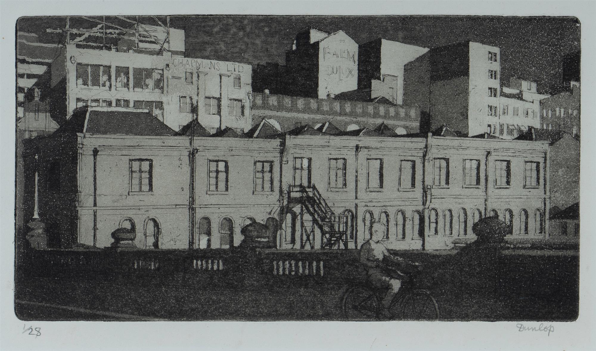 DUNLOP, Brian (1938-2009) (2) 'Pyrmont Bridge,' 1975, aquatint 1/28 (13x24cm image); and Building Alongside Pyrmont Bridge, Sydney., aquatint 11/16, (15x29.5cm image)Estimate $200-300