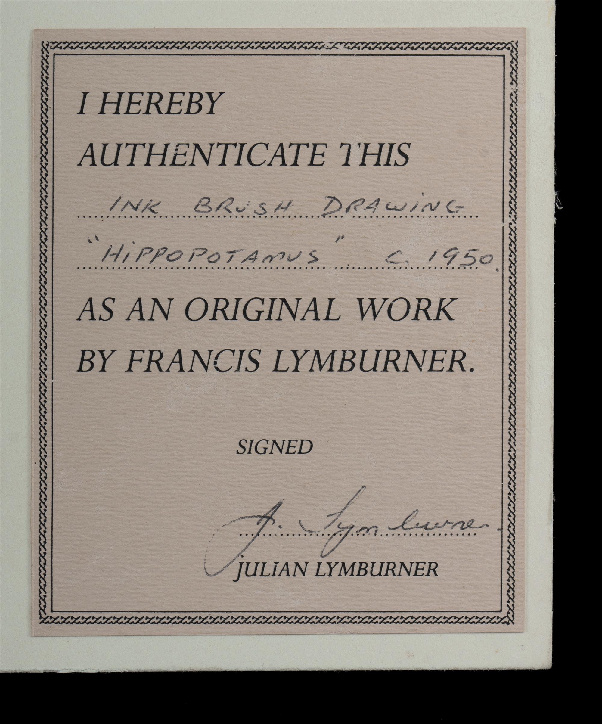 LYMBURNER, Francis (1916-1972) Hippopotamus, c.1950. Unsigned, but with estate blind stamp lower right; and certified verso by Julian Lymburner. Ink Brush Drawing 13x24cm (sheet) PROVENANCE: Deceased Estate, QLD.Estimate $200-400
