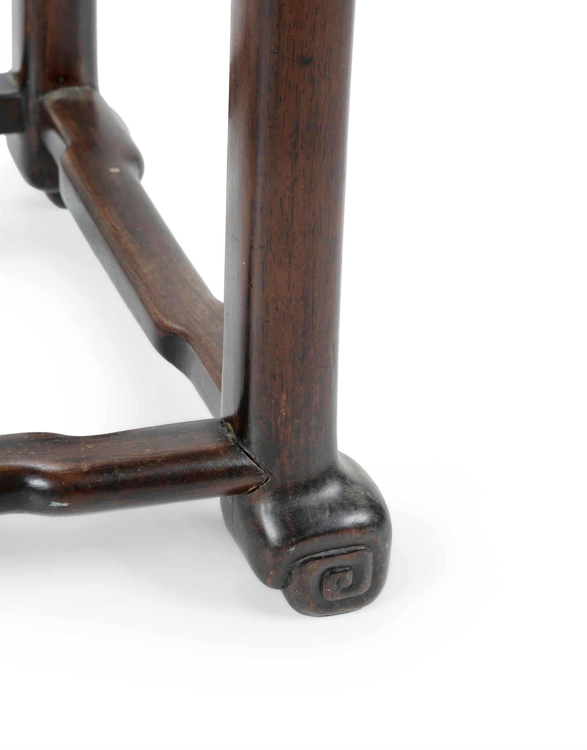 Chinese Hongmu Rosewood and Brass Inlaid Incense Stand. With dragon carved burlwood top panel, the aprons carved with lingzhi, early 20th C. (H81cm)Estimate $400-800