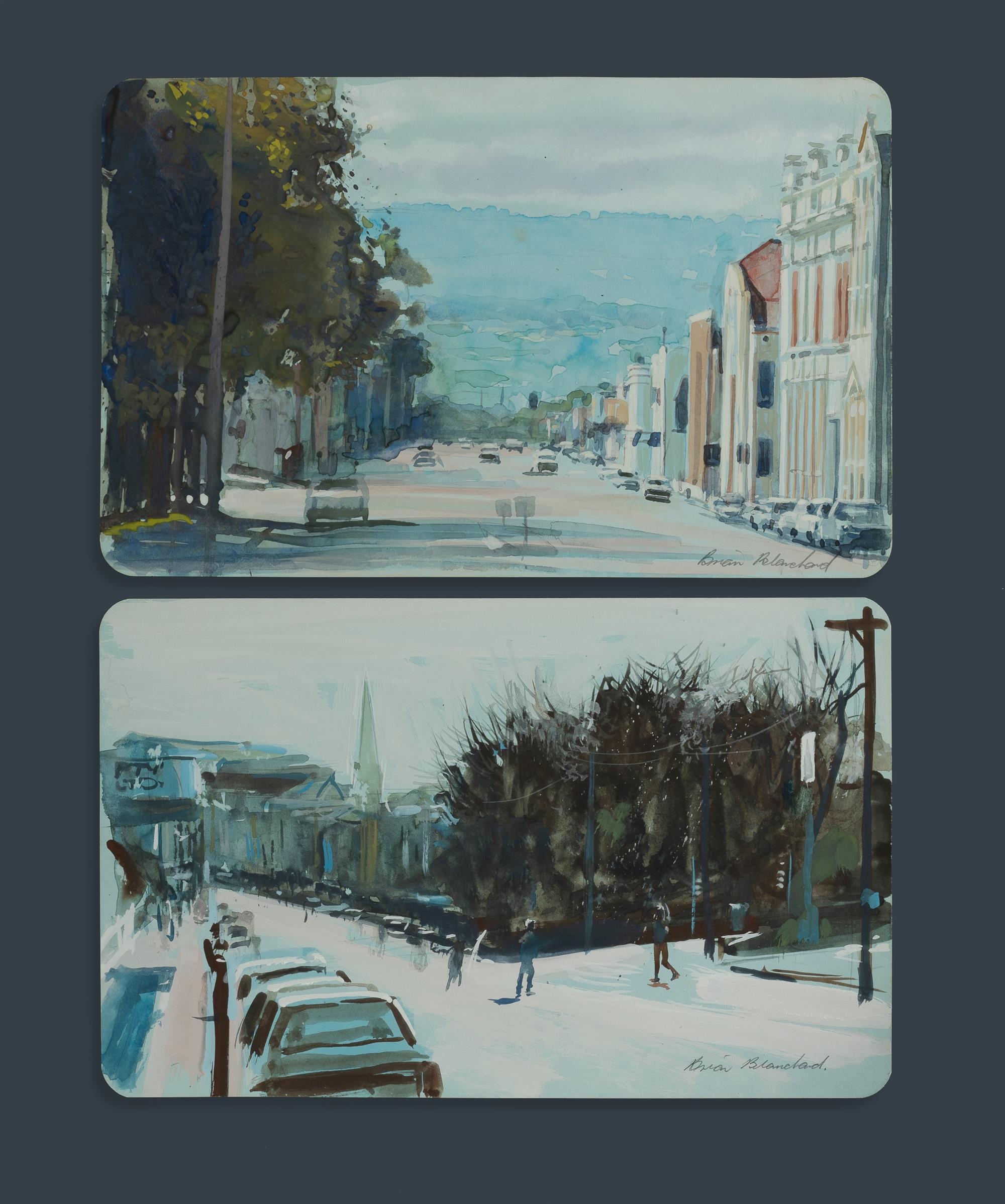 BLANCHARD, Brian (1934-2015), Seven Tasmanian Studies Includes Salamanca Market; Charles St, Launceston; Cimitiere Street, Launceston; Salamanca Place, Hobart; Elphin Street, Launceston; Roadside Trees; and Tree Study. W/Clr (7) 16x26cm each PROVENANCE: Family of the Artist.Estimate $150-300