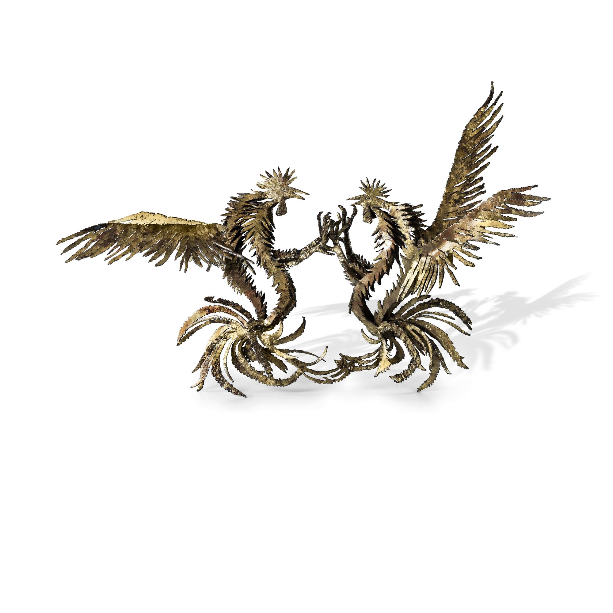 SEFFRIN, Nickolaus (German/Australian b.1931) 'Fighting Cocks' Initialled 'N' verso. Note: this sculpture is intended to hang from one or two fixed points. Mild Steel with Applied Bronze Finish 75x100x43cm (approx.) Weight 10kg (approx.) PROVENANCE: Adrien Seffrin, son of the artist.Estimate $1,000-1,800