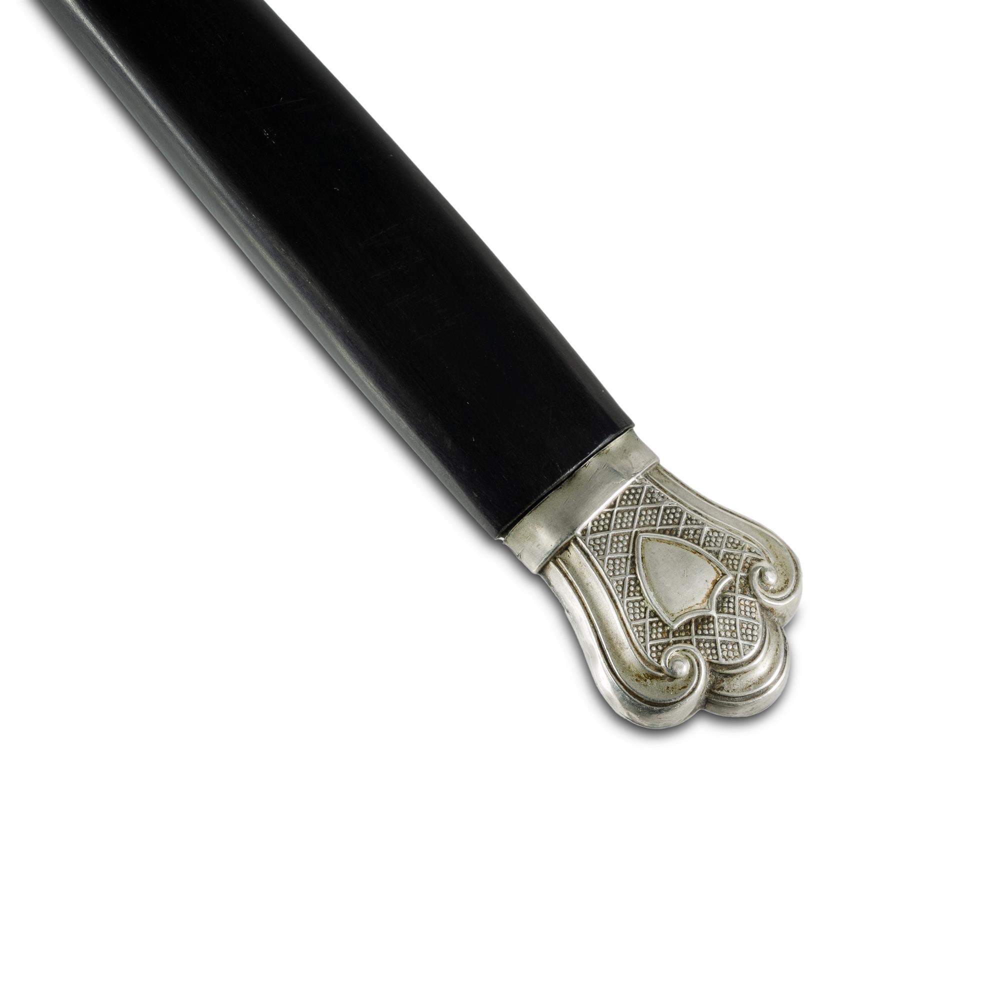 19th C Bowie by John Coe Clip point blade with false edge. Ricasso stamped 'I prefer John Coe Sheffield' within a shield escutcheon. Nickel silver oval guard, bolster and pommel. Ebony grip. In original gold embossed scabbard. (L28.5cm)Estimate $300-500