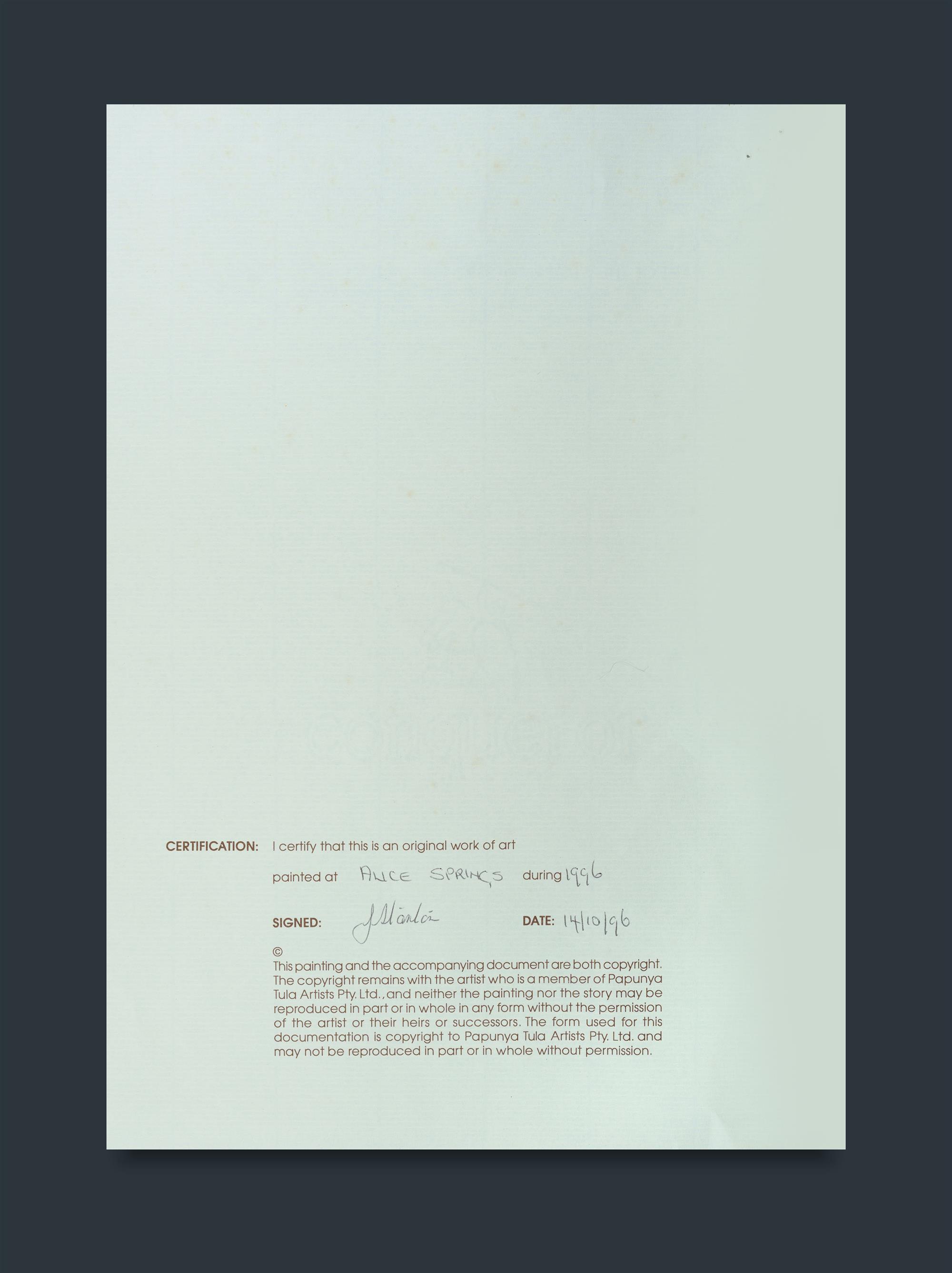NAPANGARDI, Pansy (Aboriginal born c.1940) 'Storm Dreaming,' 1996. Inscribed with cat #PN9609132, verso. Acrylic on Linen 91.5x90.5cm PROVENANCE: Papunya Tula Pty Ltd, Alice Springs (certificate of authenticity attached verso)Estimate $700-1,200