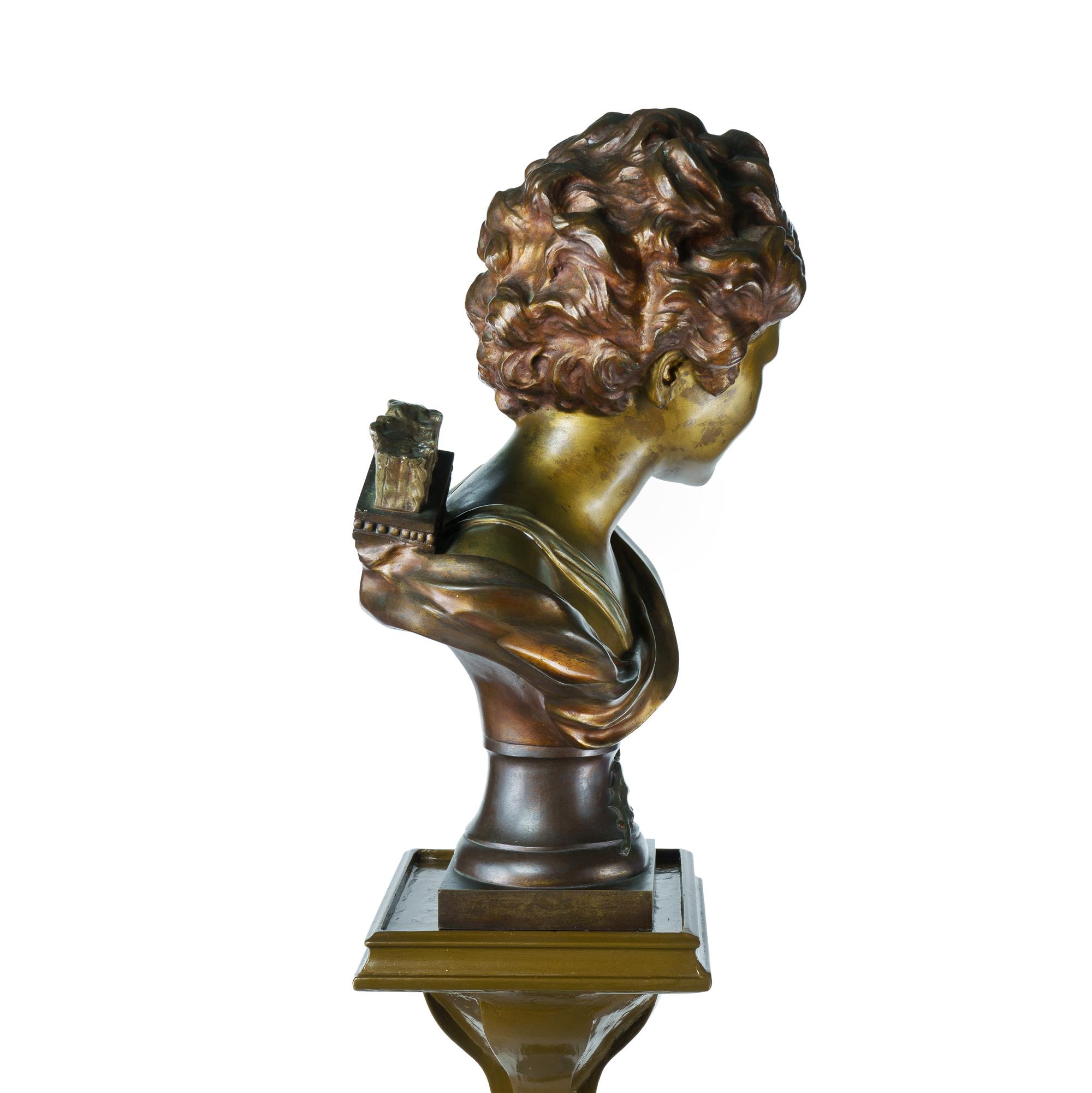 Agathon LEONARD, (French 1841-1923) Bronze Bust of Cupid on an Art Nouveau Column With a gilt finish. Cast signature 'Leonard', foundry mark for LN Paris JL (Les Neveux de Jules Lehmann) H52cm (bust) H130cm (stand)Estimate $800-1,200