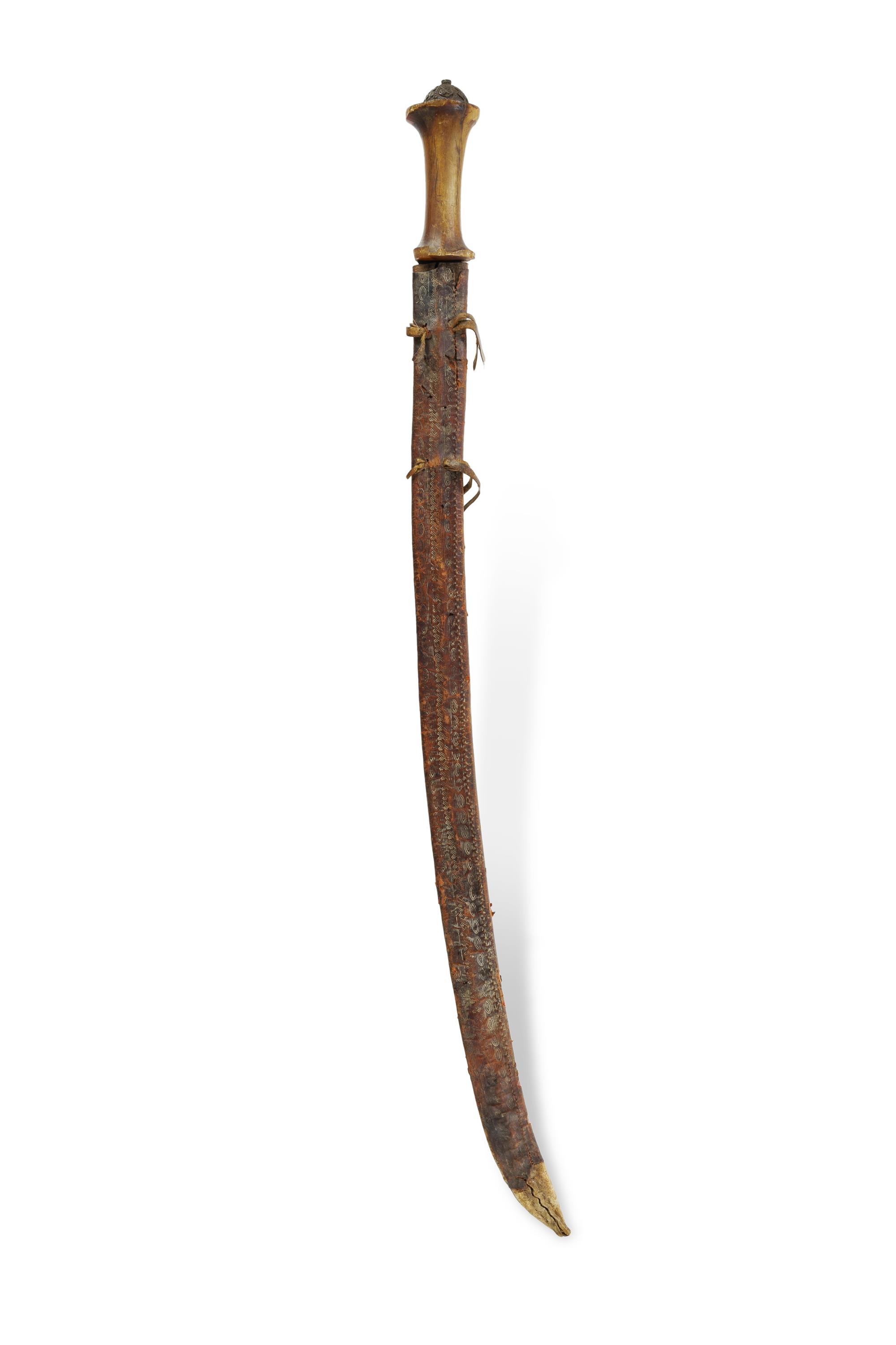 19th C Ethiopian Gurade Sword Solingen blade by W. Clauberg with 'standing knight' maker's mark. Original horn hilt with filigree pommel; tooled leather scabbard. L90cm (total)Estimate $500-1,000