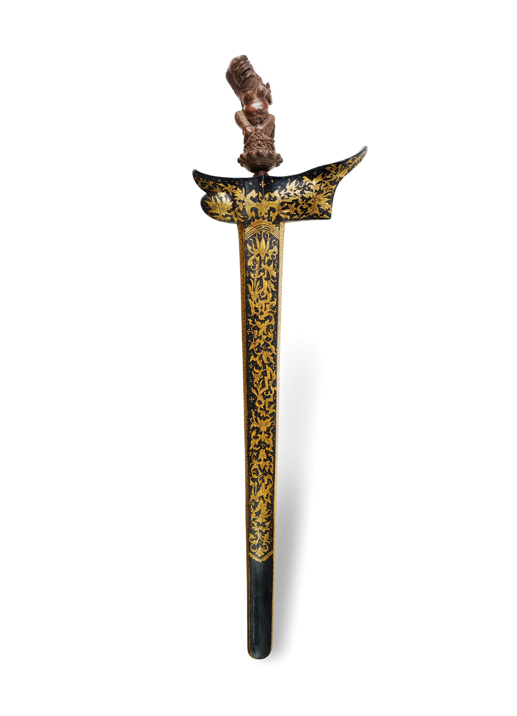 High Quality Indonesian Keris Straight, double edged pamor blade, with gold inlay. Pendock with cabochon semi precious stones. Carved wooden figural hilt. (L69cm) PROVENANCE: From the collection of the late Warren MallardEstimate $600-900