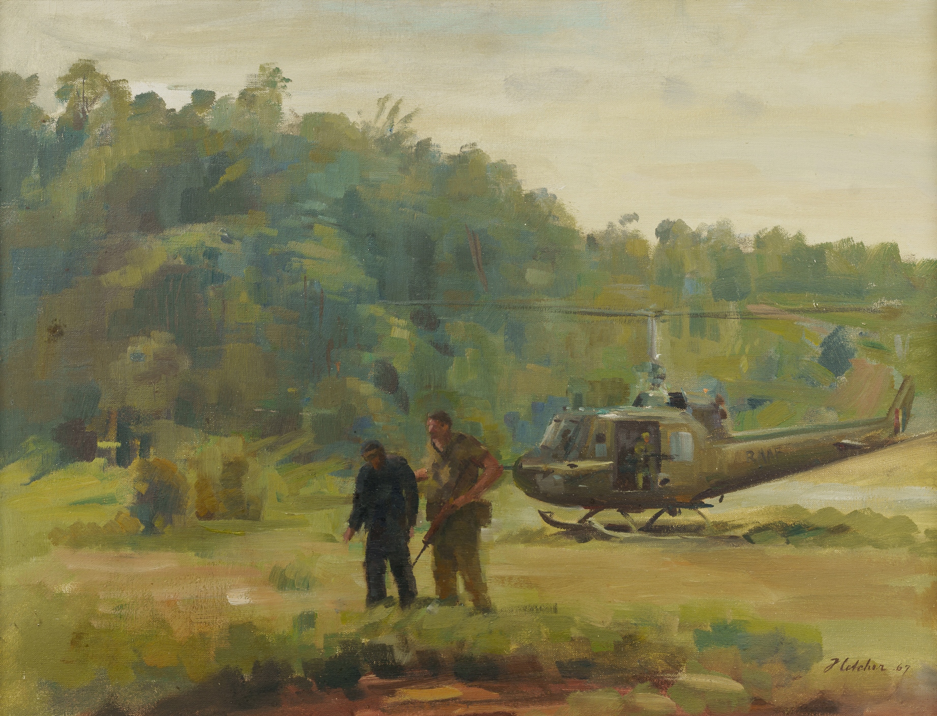 WAITE, Allan (1924-2010) (3) 'Study for Vietnam' (35x46cm); 'Sketch for Long Tan' (50x35cm); and Untitled, depiction of a 'Huey' helicopter, Vietnam (49x64cm) Oil on Canvas on Board (3)Estimate $150-300