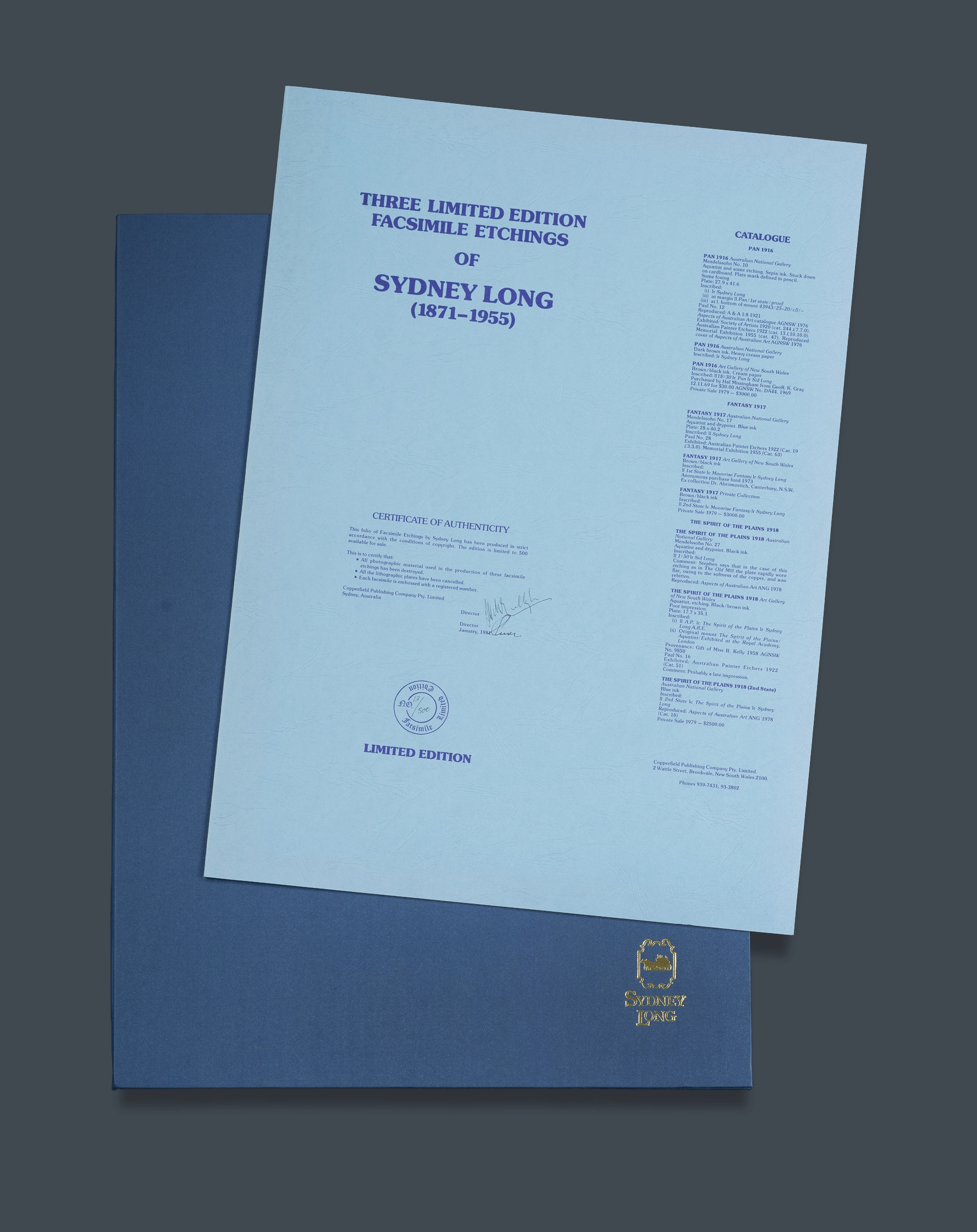 After LONG, Sydney (1871-1955) (3) Folio of Facsimile Etchings, pub. Copperfield, Sydney, 1981. Comprises: 'Pan 1916,' 'Fantasy 1917,' 'The Spirit of the Plains, 1918' Facsimile Etching (3) 13/500 40x56cm each (sheet size)Estimate $150-250