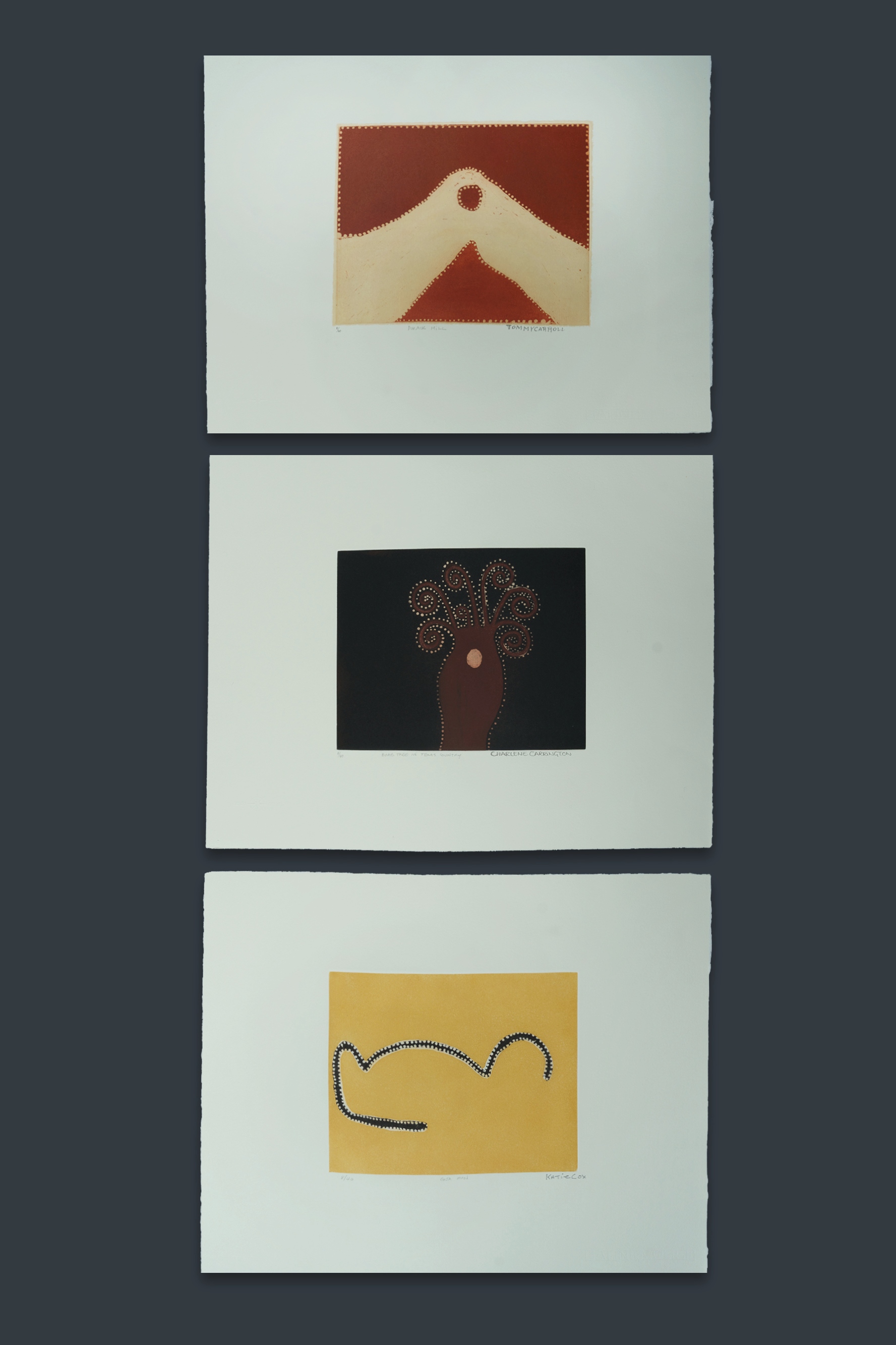WARMUN Artists (Turkey Creek, East Kimberley) (9) 'The Warmun Suite,' 2004. Complete portfolio containing 9 signed etchings by the following artists: Marcia PURDIE, Marietta BRAY, Belinda JOHNSON, Marlene JULI, Katie COX, Denise MUNG, Tommy CARROLL, Mark NODEA, Charlene CARRINGTON. Each etching is accompanied by a certificate of authenticity from Northern Editions. Presented in a handmade Oxford Buckram portfolio box. Etchings (9) 8/40 50x39.5cm (sheet) 52x41x2.5cm (portfolio box)