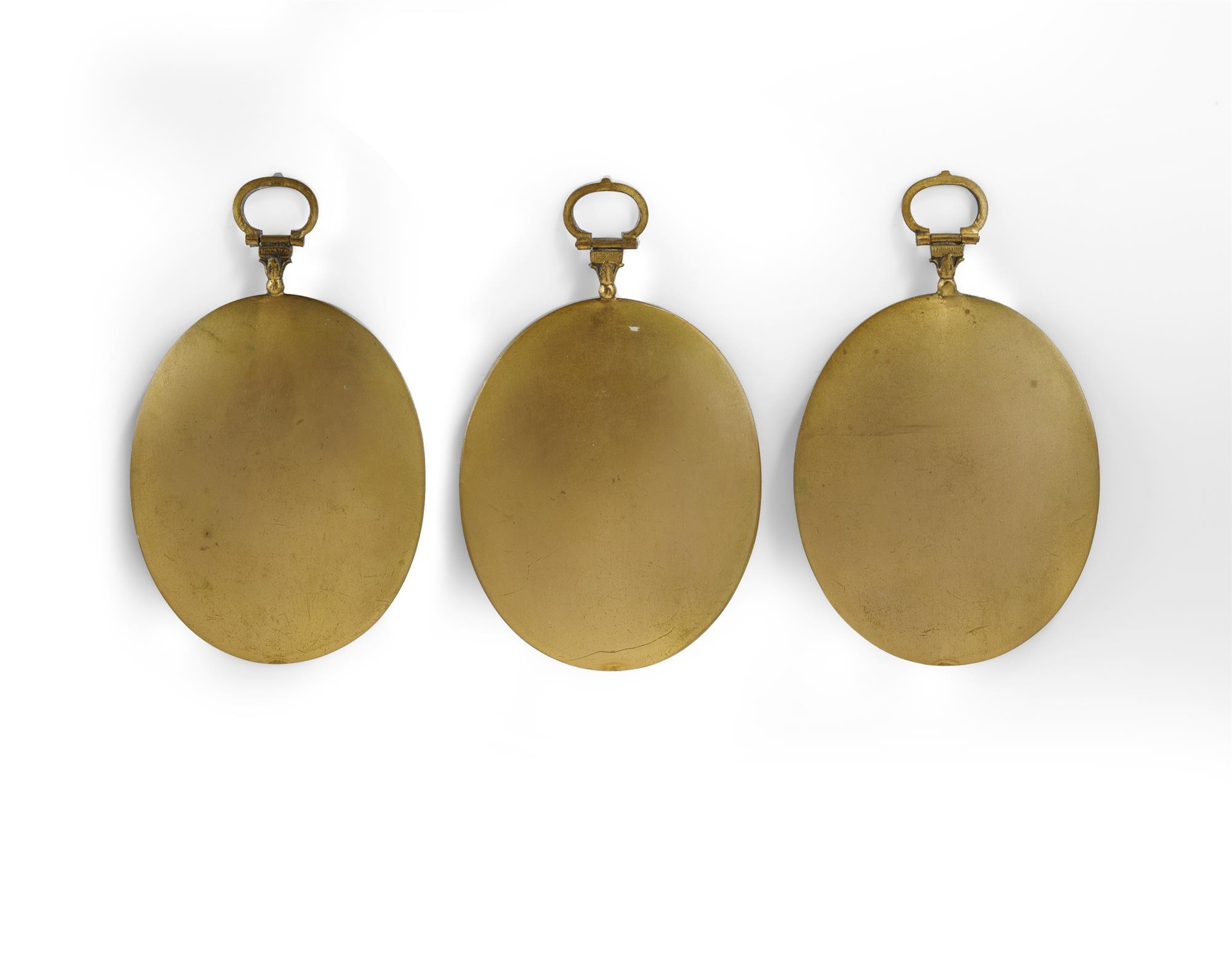 3 Miniature Portraits of Composers Depicting Wagner, Schubert and Beethoven. Each hand-painted on oval ivory panels, 2 signed 'Roy'. Set in gilt brass frames. NB: ivory export restrictions. (13x8cm frame)Estimate $300-500