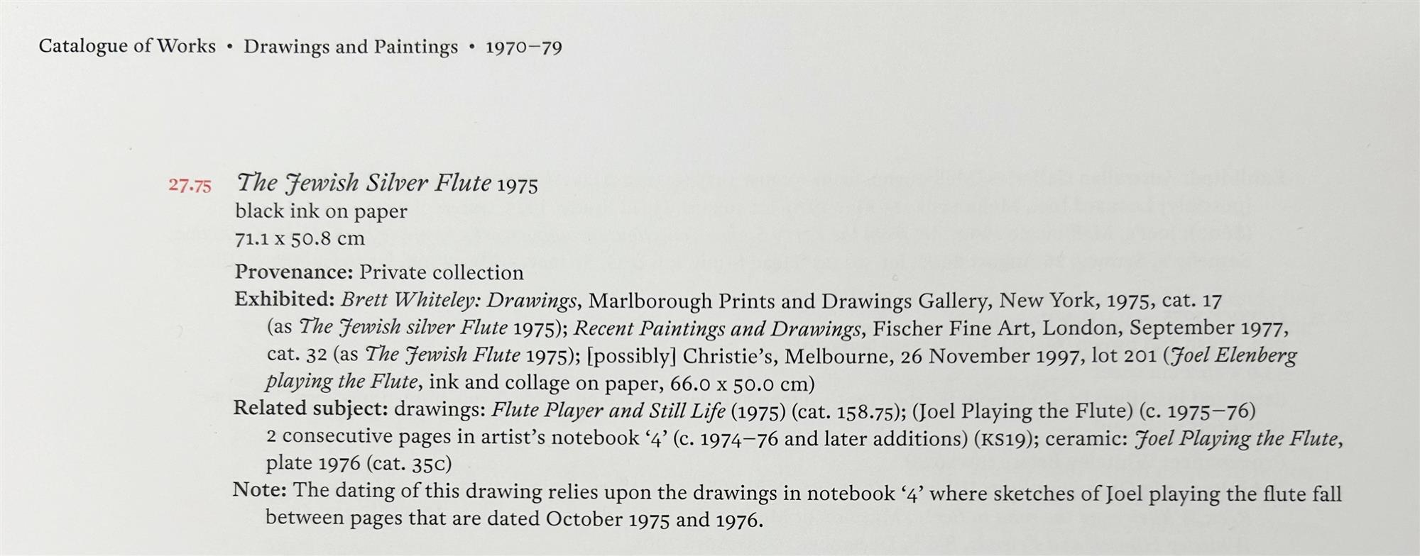 WHITELEY, Brett (1939-1992) 'Joel Elenberg Playing the Flute,' c.1975/6. Unsigned Ink on Paper with Collage 65x49cm (sight) 66x50cm (sheet) PROVENANCE: Christie's, Melbourne, November 25th 1997 (lot 201); Ken Hinds Cultural Heritage Collection, Qld. EXHIBITIONS: Caloundra Regional Art Gallery, 'Privately Collecting, Ken Hinds Cultural Heritage Collection,' Feb - Mar 2006 (catalogue included) LITERATURE: Sutherland, K., Brett Whiteley: Catalogue Raisonné, Schwartz Publishing, Melbourne, 2020, vol.7, p.320 (referenced in cat. 27.75) OTHER NOTES: © Wendy Whiteley/Copyright Agency, 2025.Estimate $45,000-65,000