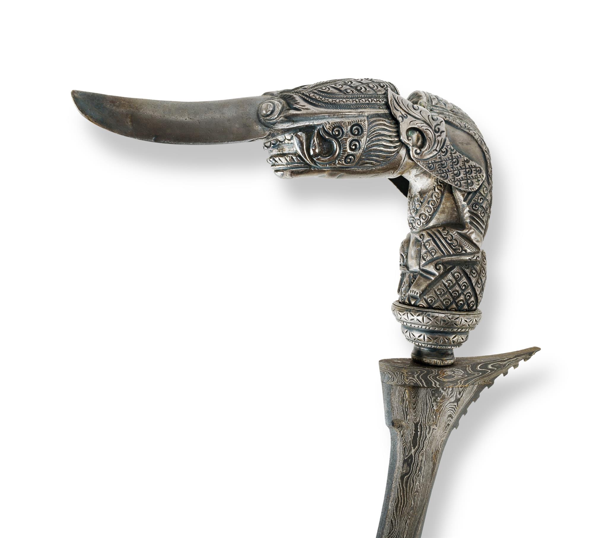 20th C. Indonesian Keris with Silver Hilt Long narrow pamor steel blade with a silver overlaid Tajong (Kingfisher) hilt. (L52cm)Estimate $200-300