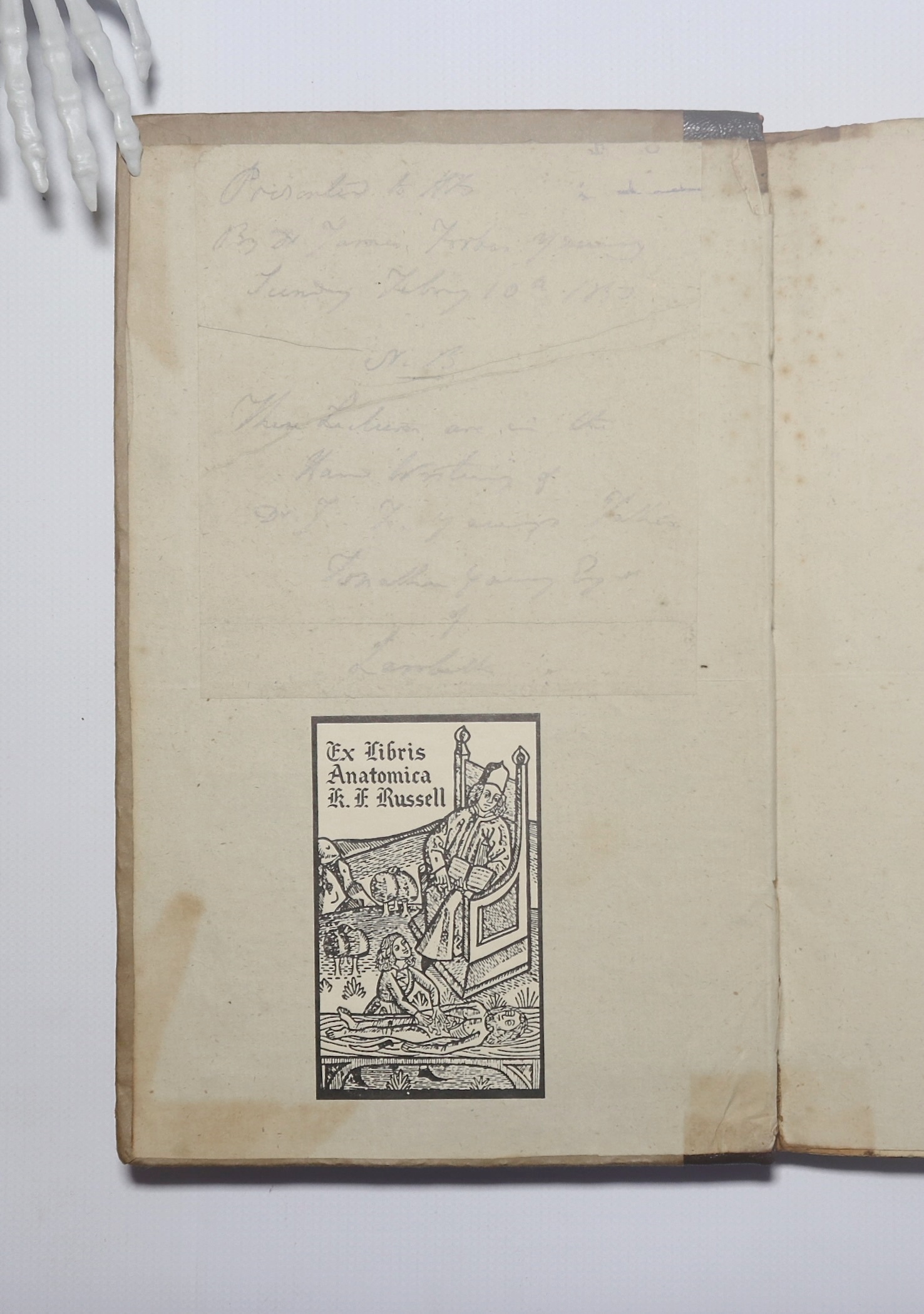 FORDYCE, George. The Natural History of the Human Body by Dr. G. Fordyce Essex Street, Strand, London. Taken by J. Young surgeon. Bound manuscript of 251 pages. Pencil note inside front cover. 'Presented to H. B. by Dr. James Forbes Young, Sunday Febry 10th 1850. NB: these lectures are in the hand writing of Dr J. F. Young's father Jonathan Young Esqr. of Lambeth.' There is no date but probably in last quarter of 18th century. Fordyce (1736-1802) graduated in Edinburgh (1758) and came to London where he studied anatomy under William Hunter. He started his course of lectures in 1764. There are 34 lectures recorded on subjects such as Lymph, Mobility, Opinions of the ancients concerning the electric fluid of the nerves….etc. etc. Final 50 pages are a long discourse on 'the Human Bile from Maclurg's Experiments…' Later binding in quarter leather on plain paper boards. Dusting to the text block, contents clean and straight. Bookplate for K.F. Russell. (261x165mm)