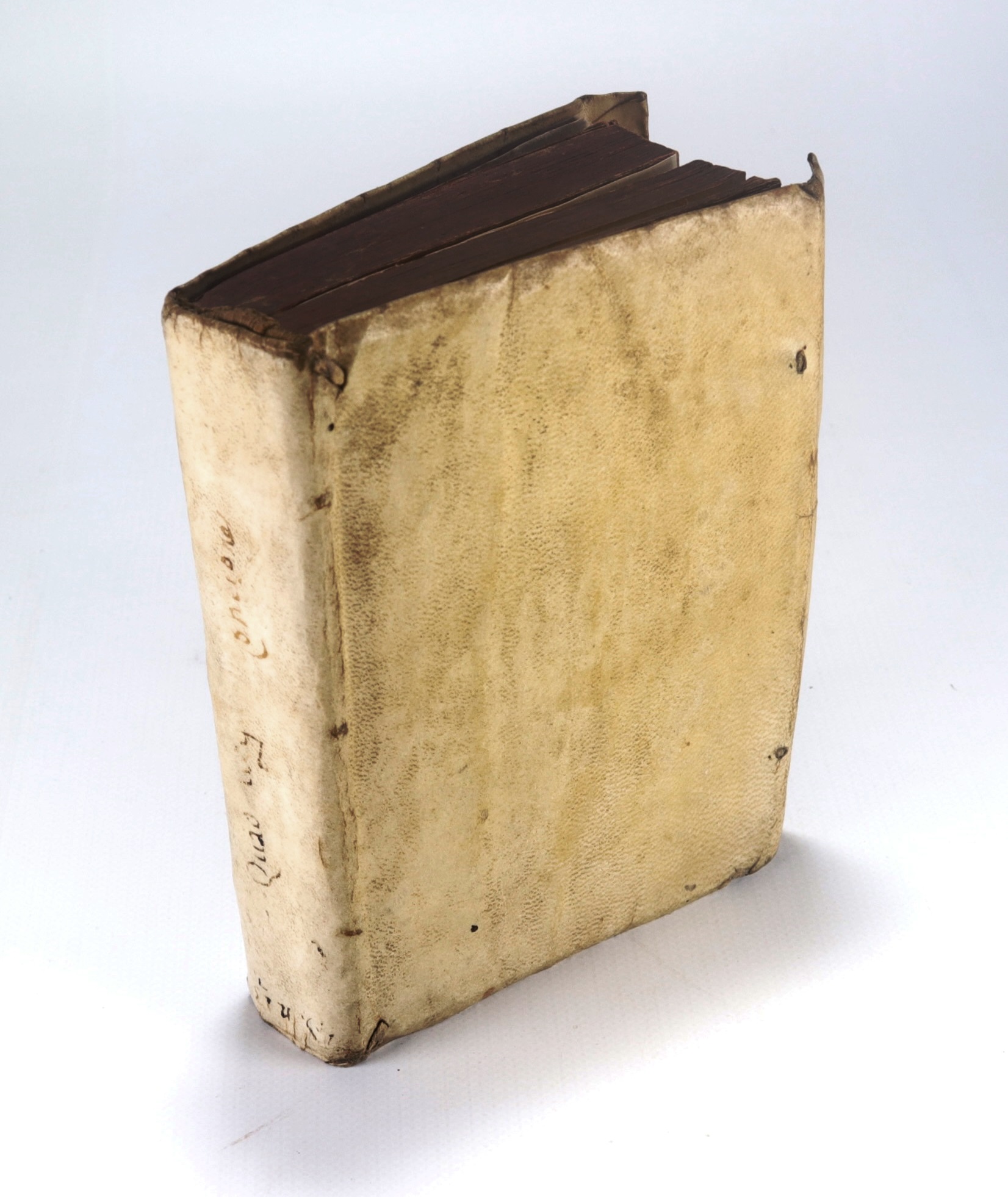GUIBELET, Jourdain. Trois Discours Philosophiques. Le I. de la camparaison de l'Homme avce le Monde. Le II. du Principe de la generation de l'Homme. Le III de l'Humeur Melancholique. Mis de noueau en lumier par Jourdain Guibelet M. Pub. A EVREUX: Chez Antoine le Marie, 1603. Avec privelege du Roy. [10]leaves, 286pp, [8]leaves. The two engraved plates, one showing the anatomy of man, and the other the anatomy of a woman are lacking, but supplied in photographic facsimile. Vellum binding is stained and worn. Engraved title with stain and chip to the bottom. Text toned but overall good. Has fairly frequent underlining plus very neat ink notatons. Bookplate: Ex Libris Anatomica K.F. Russell. (160x107mm)