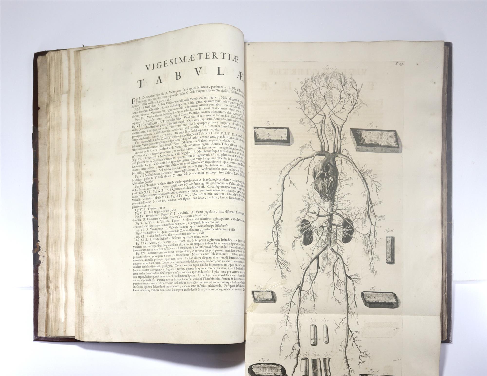BIDLOO, Govert. Anatomica Cumani Corporis Centum & quinque Tabulis, per artificiosiss G de Lairesse ad vivum delineatis demonstrata…. Pub. AMSTELODAMI: samplibus viduae Joannis a Someran, Haeredum Joannis a Dyk, Henrici and viduae Theodari Boom. 1685. Frontispiece, title, portrait, 67 leaves :: 105 plated (some folded) Supplement 3 leaves :: 5 plates (2 plates on 1 leaf) (the signatures are *1, *2, *3) 'Supplement in this copy is not known and KFR can find no reference to it in the literature.' Also a loosely inserted frontispiece (loss to top LH) with pasted over cartouche 'The anatomy of Humane Bodies, by Willm. Cowper Surgeon 1698.' Likely excised from Cowper's plagiarised publication. Plus, folded full leaf with copies of plates 16 & 28 drawn in ink. Legends in English. A landmark work in medical history. Govard Bidloo (1649-1713) began this project with de Lairesse around 1676 while writing plays in Amsterdam, studying for his medical degree, and working as a surgeon. The artist Gérard de Lairesse (1641-1711) was inspired by Rembrandt. The figures are displayed realistically, with dissections contrasted against natural flesh, and an occasional book, inkwell or other object appearing in the compositions. Original boards, poor condition, incorporated into later rebinding with newer spine and corners. Text block dusted to the top edge. Contents have mild toning, foxing spots, damp stains, offsetting, and rare finger soiling. Noted 2 pages with short edge tears. The two folding plates have repaired tears. Overall this work presents well for age. Refer to images which give a fair indication of condition. Previous owners inscription to flyleaf, Antonio Francesco Bertini (1658-1726) Professor of Medicine at Ospitale St. Maria Nuova, Florance. Also Library of Eugen Alexander Polya (1876-1944) purchased by Russell from his daughter. Bookplate: Ex Libris Anatomica KF Russell. (524x365mm)