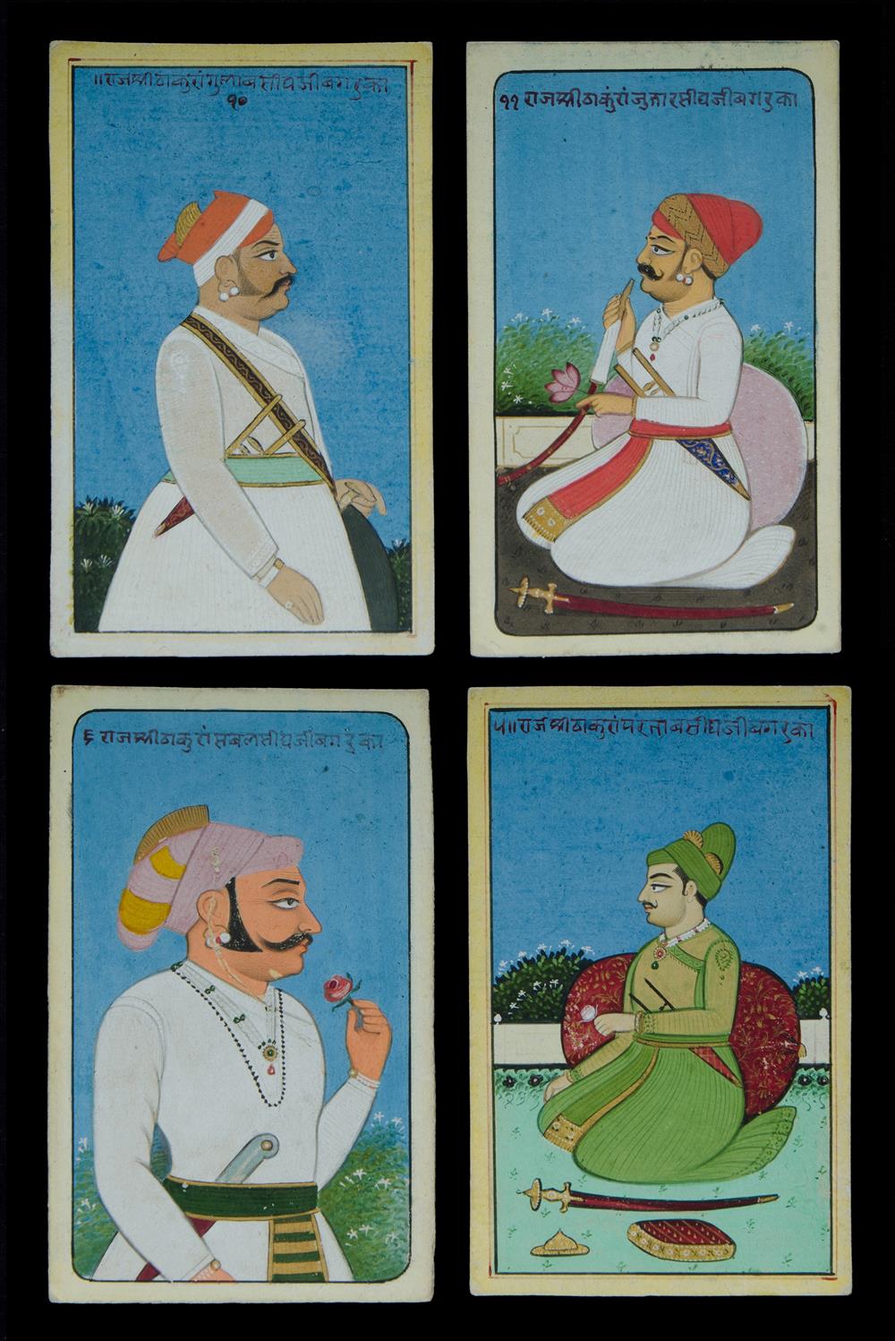 8 Portraits of Indian Emperors. 7 inscribed verso as representing personages from Bagroo (Bagru, Rajasthan) Gouache, Ink & Gilt on Card (8) 11x6cm (each) Estimate $500-700
