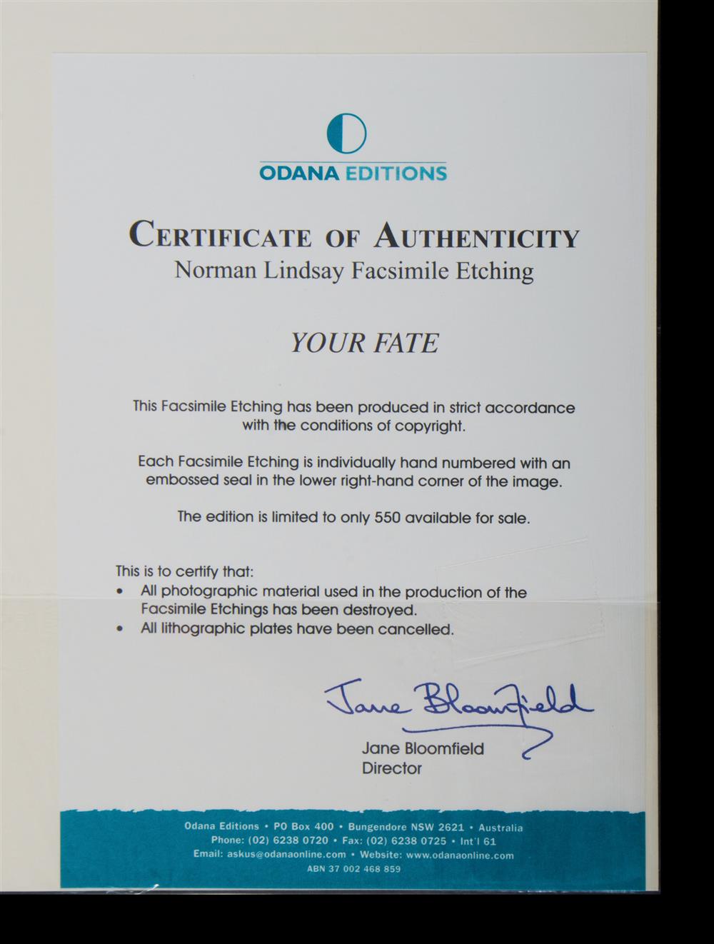 LINDSAY, Norman (1879-1969) (2) 'Columbine' (21.5x21.5cm) and 'Your Fate' (14x11.5cm) Folio of 2. Certificate of authenticity from Odana Editions. Facsimile Etching 111/550 (2) Estimate $200-400