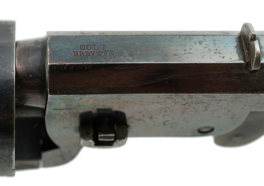 Colt 1855 Model Brevet Revolving Carbine. With chequered walnut stock. Engraved cylinder & frame. Barrel marked 'Colt Brevete' (L101cm) Estimate $3,000-5,000
