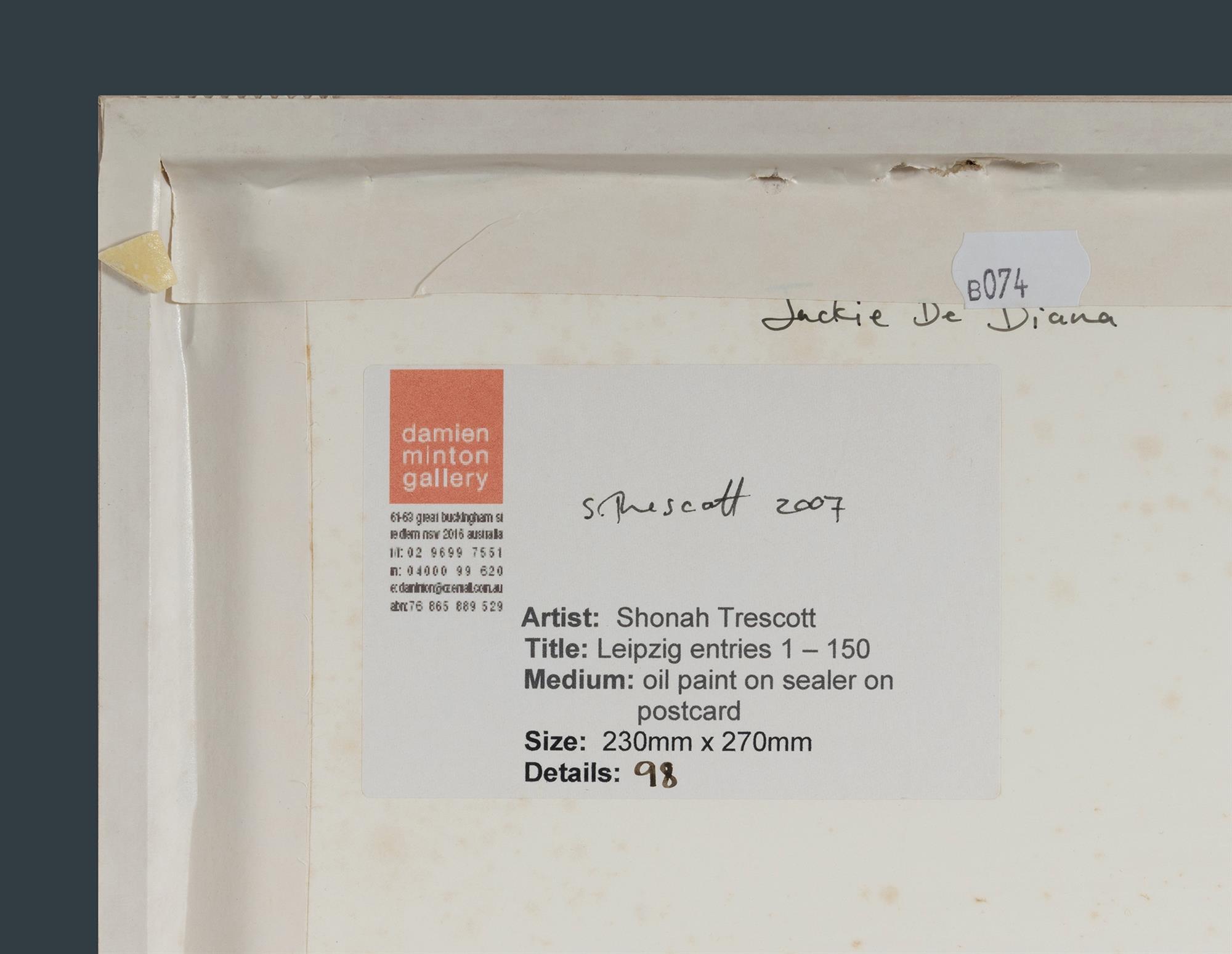 TRESCOTT, Shonah (b.1962) (2) 'Leipzig entries 1-150, #75 & #98,' 2007. Each signed & dated verso; ex Damien Minton Gallery (labels). Oil on Sealer on Postcard (2) 10x14.5cm each (image)Estimate $400-600