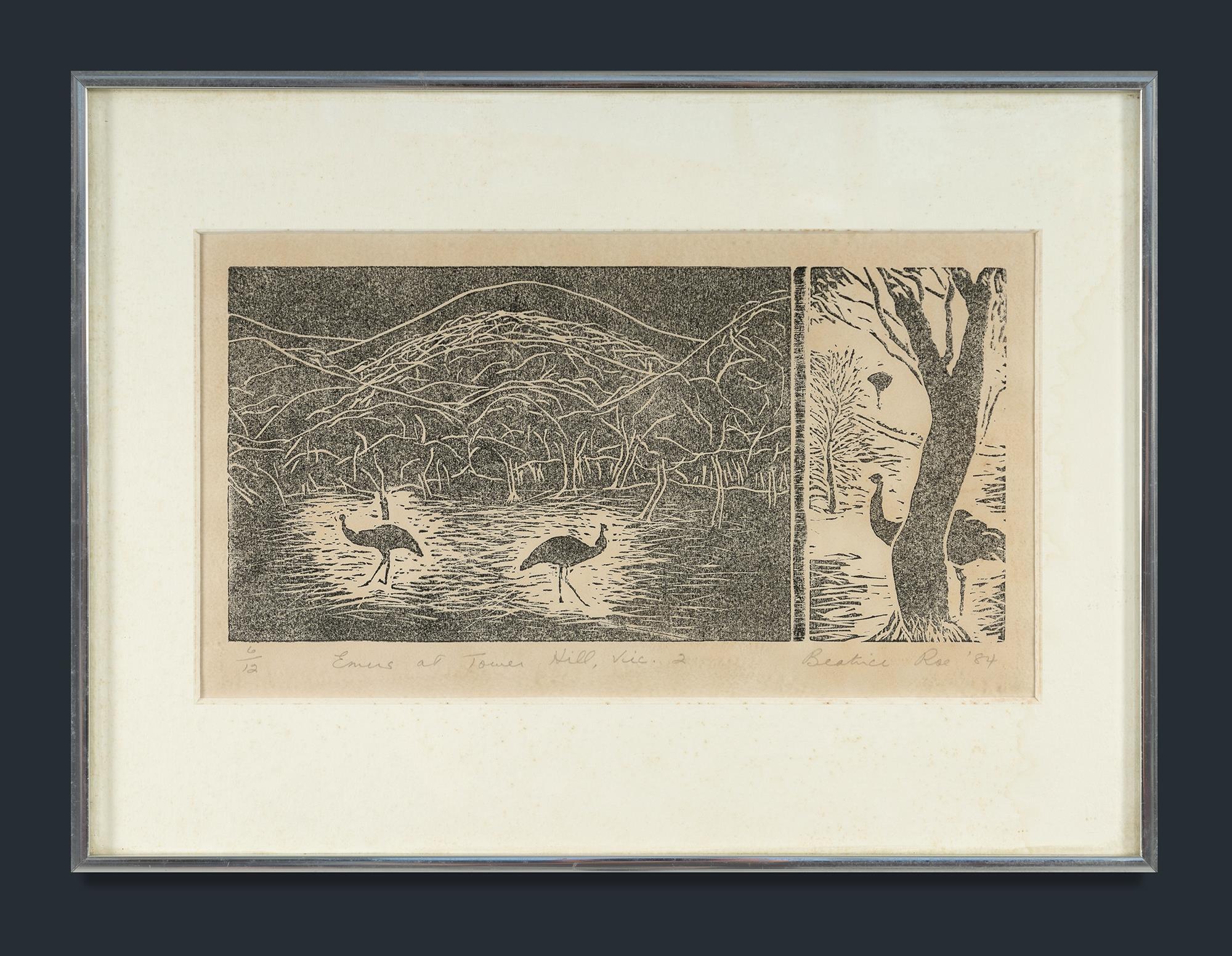 ROE, Beatrice (1920-2019) (3) 'Emus at Tower Hill, Victoria,' 1984, ed 1/6 (15x22cm); 'Emus at Tower Hill, Vic. 2,' 1984, ed. 6/12 (15x30.5cm); & 'Still-life with Napkin,' 1987, ed. 4/8 (7x30cm). Linocut (3)Estimate $60-120
