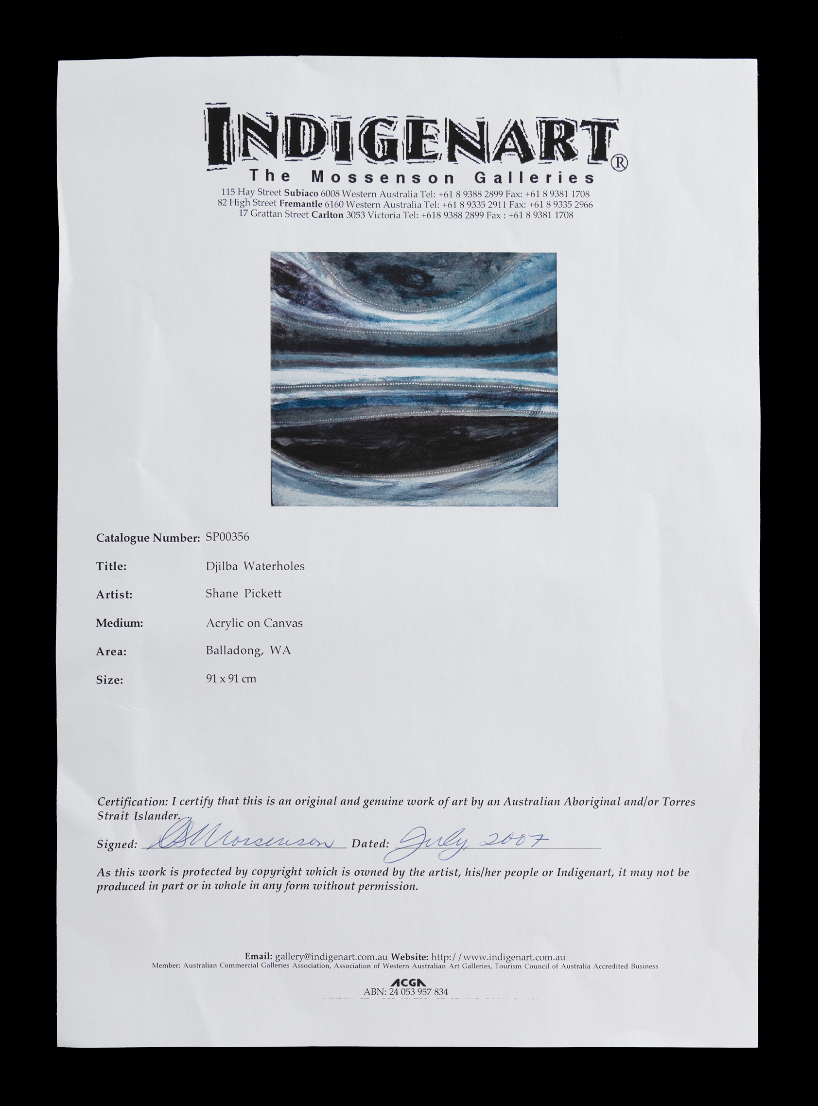 PICKETT, Shane (Aboriginal 1957-2010) 'Djilba Water Holes,' 2007. Accompanied by Indigenart, The Mossenson Galleries certificate of authenticity, cat #SP00356. Acrylic on Canvas 91x91cmEstimate $1,000-2,000