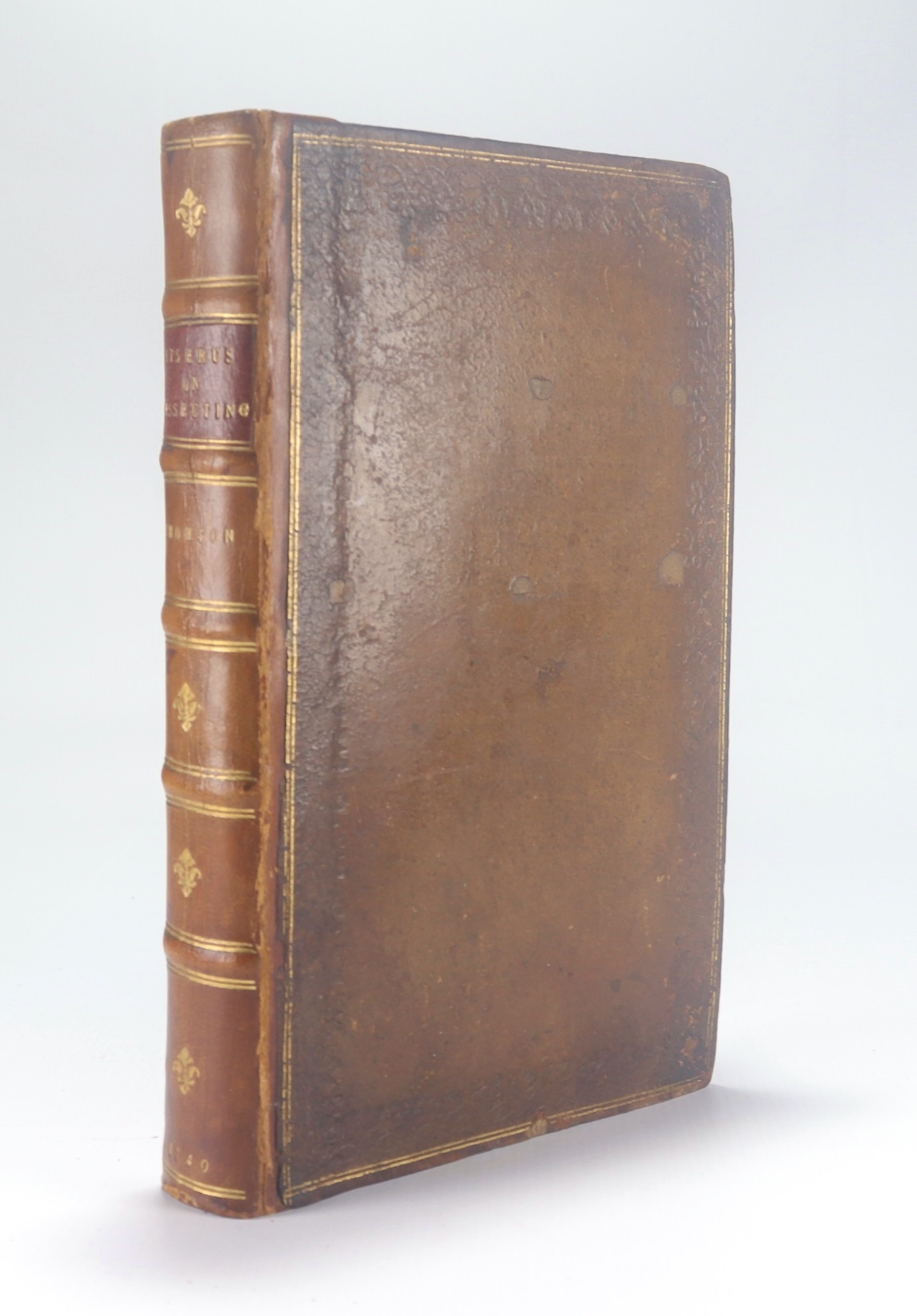 LYSER, Michael. The Art of Dissecting the Human Body, in a Plain, Easy and Compendious Method. With the several instruments necessary, curiously engraved; wherein all the different Parts of the Human Body are described, but particularly the muscles, in a full and accurate Manner, and their Uses clearly explained. Translated from the Latin of Lyserus. By. G. Thomson, M. D. Pub. LONDON: Printed by Joseph Davidson, at the Angel in the Poultry. MDCCXL [1740]. 'Lyser's Culter Anatomicus, first published in Copenhagen in 1653, was one of the forbears of the modern dissecting manual. An abridged translation into English is in LE CLERC, D and MAGNET, J.J. Bibliotheca anatomica, medica, chirurgica etc. containing a description of the several parts of the body... London, 1711, 1712, 1714 (see 524), volume 2, pp.1-62. The Latin version appears in the 1685 and 1699 editions of Bibliotheca anatomica.' (Russell British Anatomy 554) Russell further writes.. 'this translation by Thomson is an extraordinarily rare book for no obvious reason.' (private catalogue). 'There is no copy in the British Museum and the copy in the National Library of Medicine, Bethesda, lacks one plate. There is no copy in the Hunterian Library, Glasgow or in the Cushing Library.' Collation, 8° A6 B-S8 T2 ($1-4 signed) 144 leaves; pp. [2] iii-xii 1-276. Three plates. Bound in full leather, with a later spine, aged. Foxed title precedes a fairly clean text with a modicum of foxing and marks. Plates more marked and soiled, refer to images. Book label for Frederick Wood Jones, bookplate for K.F. Russell. (200x124mm)