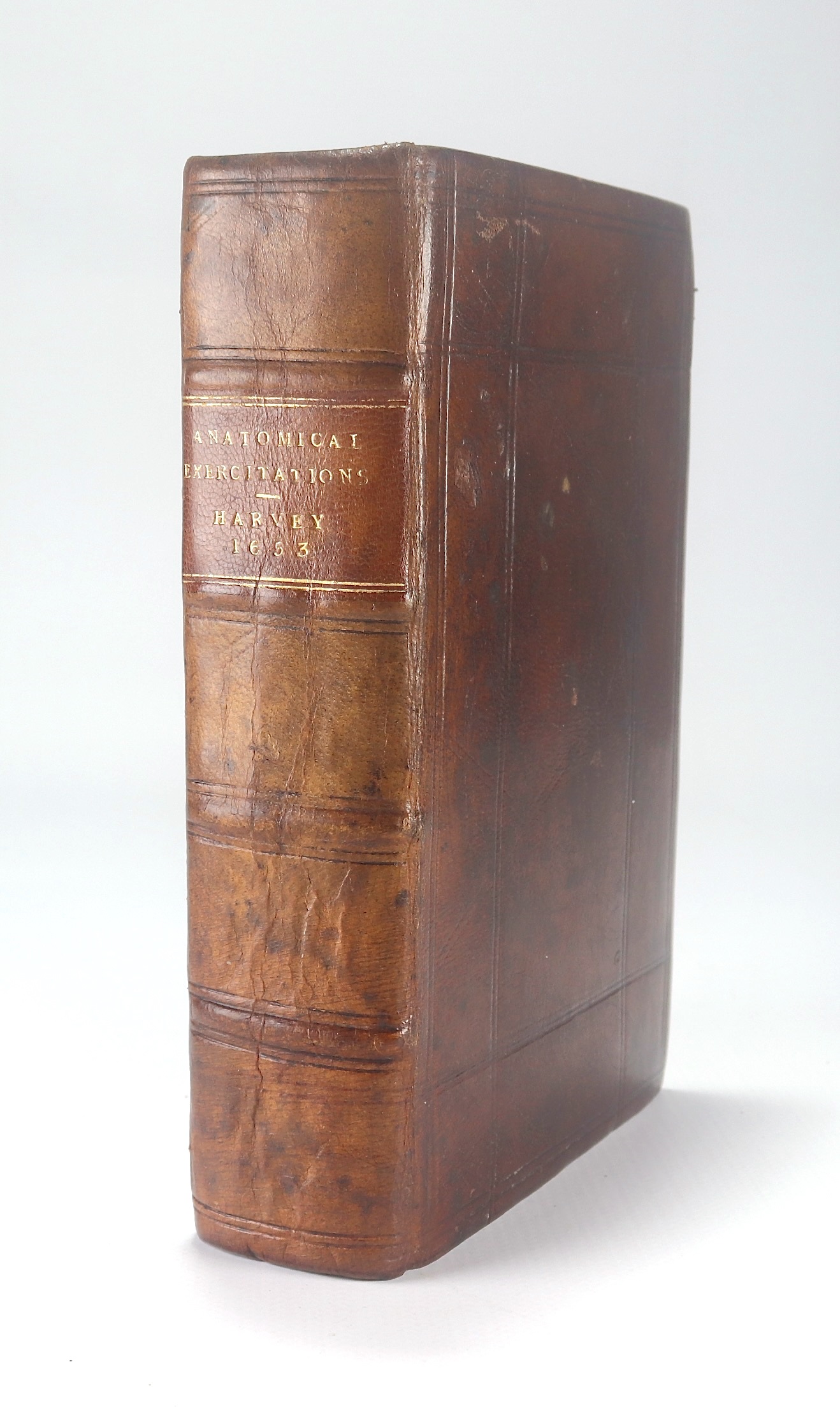 HARVEY, William. Anatomical Exercitations, Concerning the Generation of Living Creatures: To which are added Particular Discources, of Births and of Conceptions &c. Pub. LONDON: Printed by James Young, for Octavian Pulleyn, and are to be sold at his shop at the sign of the Rose in St Paul's Churchyard. 1653. 'Harvey's excellent work on generation first appeared in Latin in 1651 printed in London. The English translation is very rare. 'Harvey was among the first to disbelieve the erroneous doctrine of the 'preformation' of the foetus; he maintained that the organism dervies from the ovum by the gradual building up and aggregation of its parts. The chapter on midwifery in this book is the first work on that subject to be written by an Englishman. This book also demonstrates Harvey's intimate knowledge of the existing literature on the subject. He corrected many of the errors of Fabricius. Harvey considered this to be the culminating work of his life and more significant then De motu cordis.' (Russell) The chapter on labour, De Partu, is the first original work on obstetrics to be published by an Englishman. Brief collation; Portrait, title, [22]leaves, 566pp, [1]leaf (errata) [1] Portrait facsimile. Stub of original still between A7 and A8. The Faithorne bust of Harvey is missing in the majority of copies, being eagerly sought after by print collectors. Older rebinding in ruled full leather is in good condition, spine a little sunned. Title is soiled with an old, small, foredge repair. Text block dusted to the top. Greater bulk of the text is quite clean and straight. Final Erata leaf is soiled and stained. Owner details William Simpson, Surgeon, Knaresbro (Yorkshire), bookplate and his signature on title. Bookplates: Simpson, William Surgeon, Knaresbro. The bookplate appears to be 17th century, the date 1696 is added in pencil, also, Ex Libris Anatomica K.F. Russell. (167x108mm)