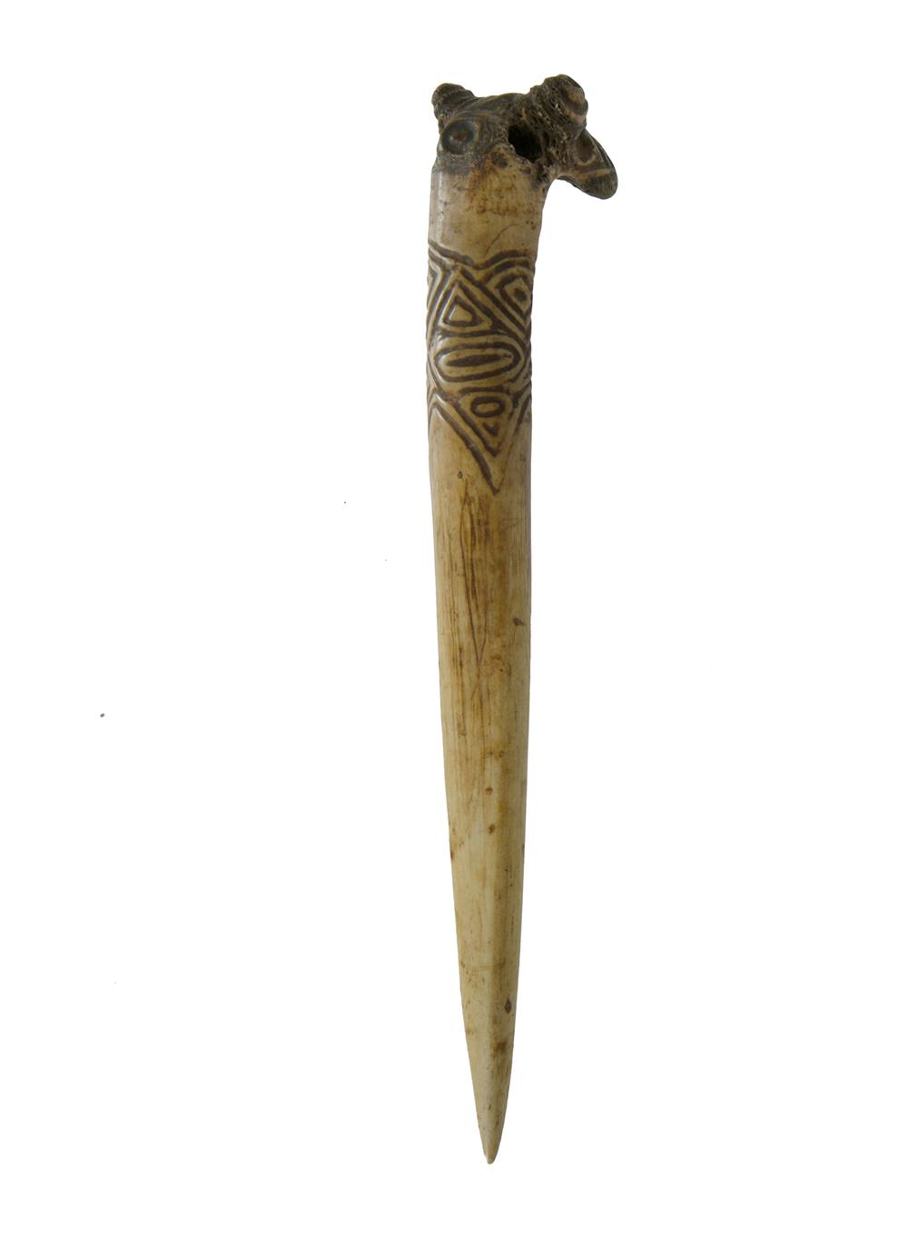 5 Various Bone Daggers. One, cassowary bone dagger, Sepik River region of Papua New Guinea Highlands, collected prior to World War II (35cm). Two, engraved (30cm & 34cm) and, two carved & engraved (39cm), good patina, early 20th C, Sepik River, Papua New Guinea, Dr P Elliot collection (1965) with bird finials (L39cm). Collection Dr John Raven, Perth. Estimate $300-600