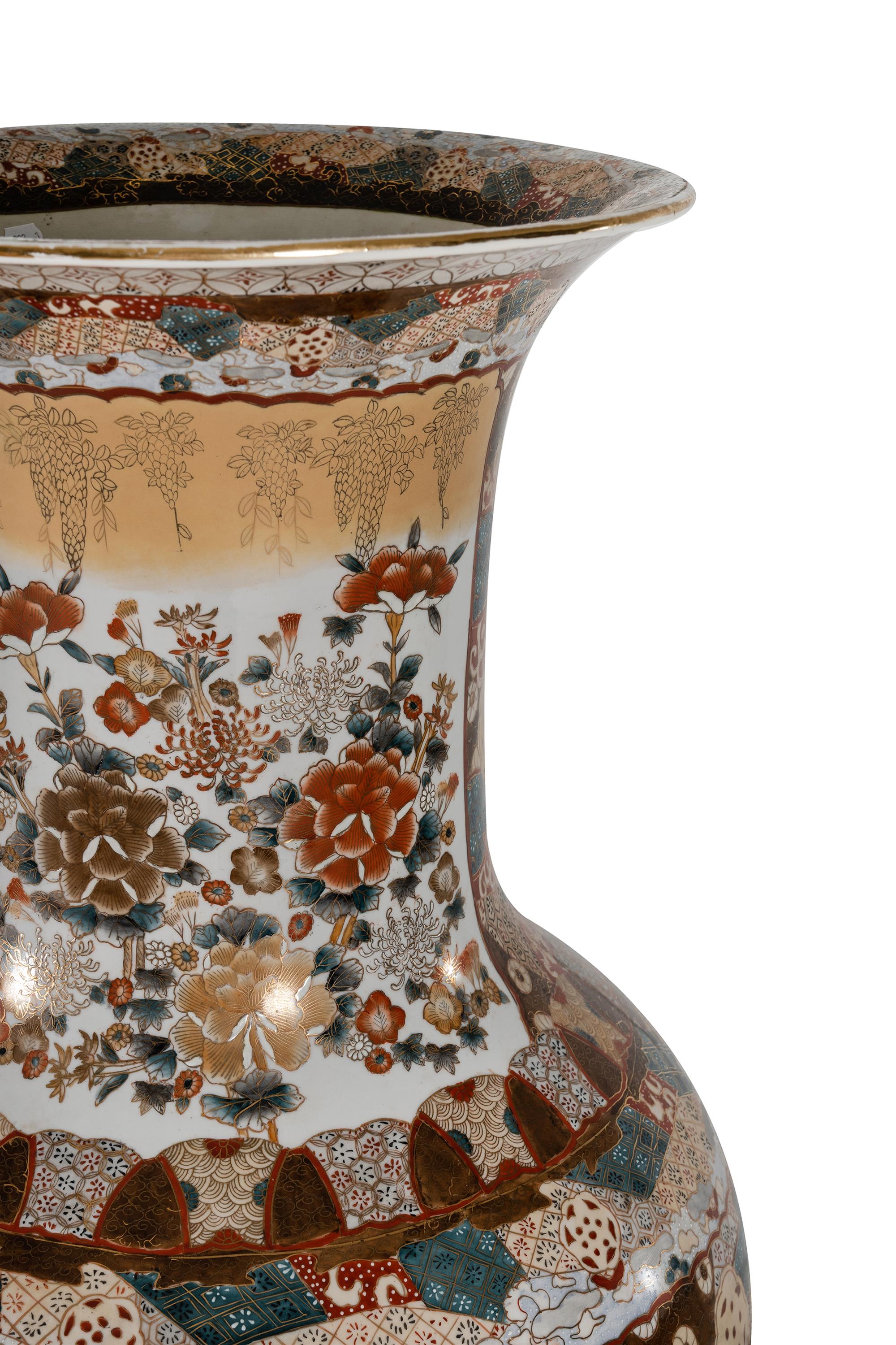 Pr Monumental Imari Pattern Floor Vases of Classical Form. Hand painted with floral & brocade panels. (H144cm Dia 51cm)Estimate $2,000-4,000