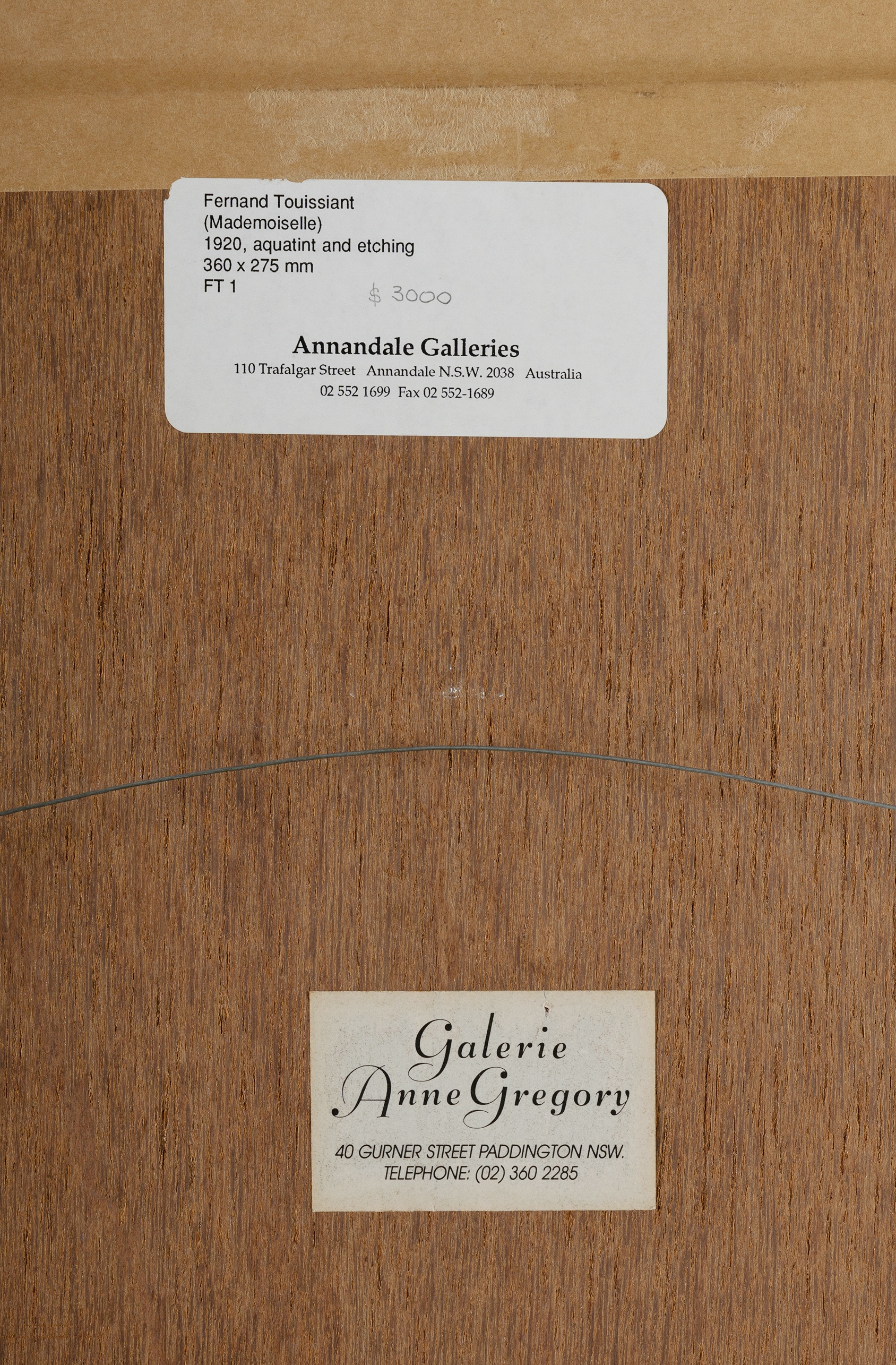 TOUSSAINT, Fernand (Belgian 1873-1956) Mademoiselle, 1922. Annandale Galleries, Sydney, label verso. Aquatint & Etching 49x39cm (plate)Estimate $150-300