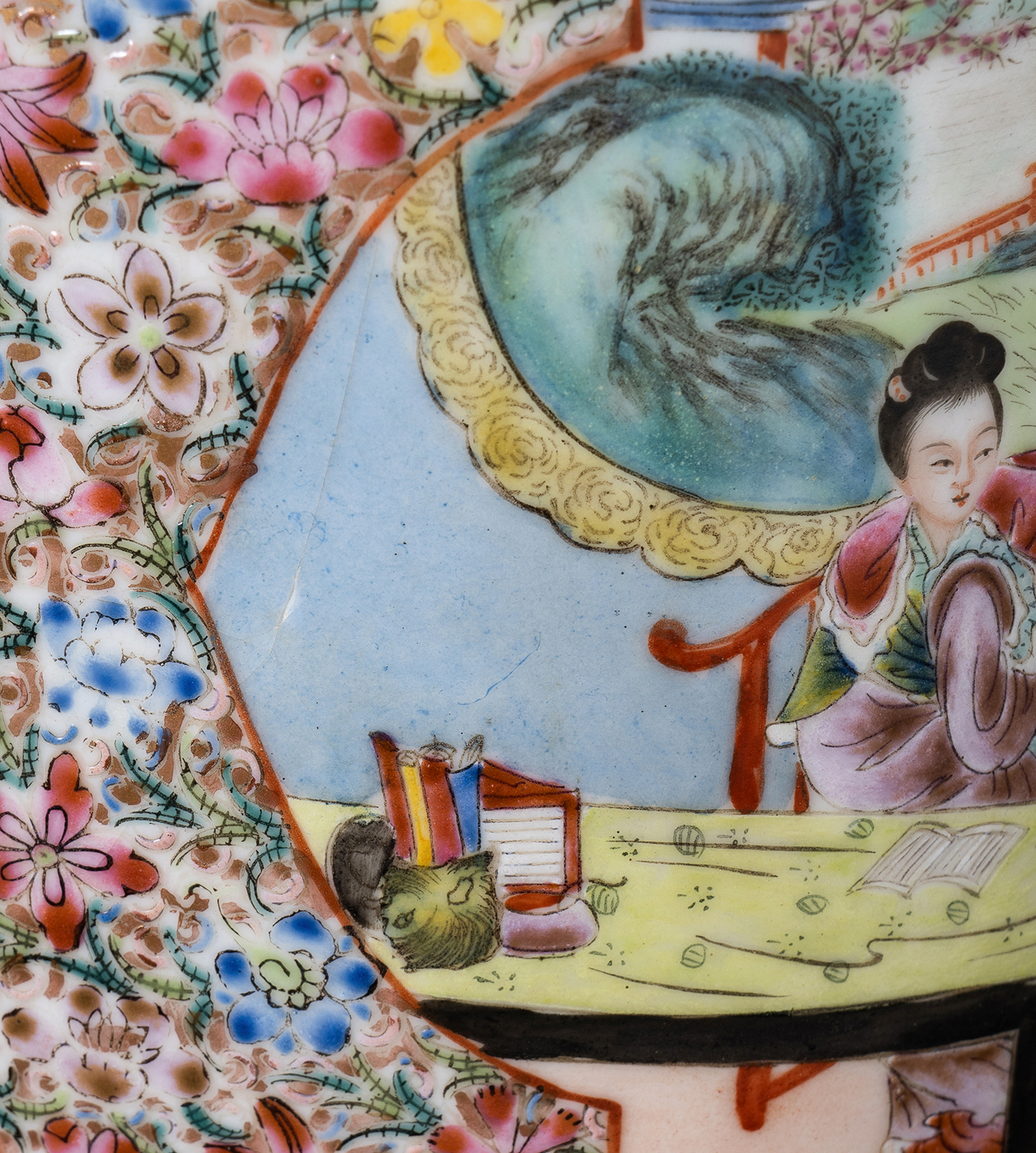 Chinese Porcelain Famille Rose Rouleau Vase. With reserve panels depicting ladies indoors & in a garden. 4 character reign mark to base, hairline crack. (H28cm)Estimate $200-400