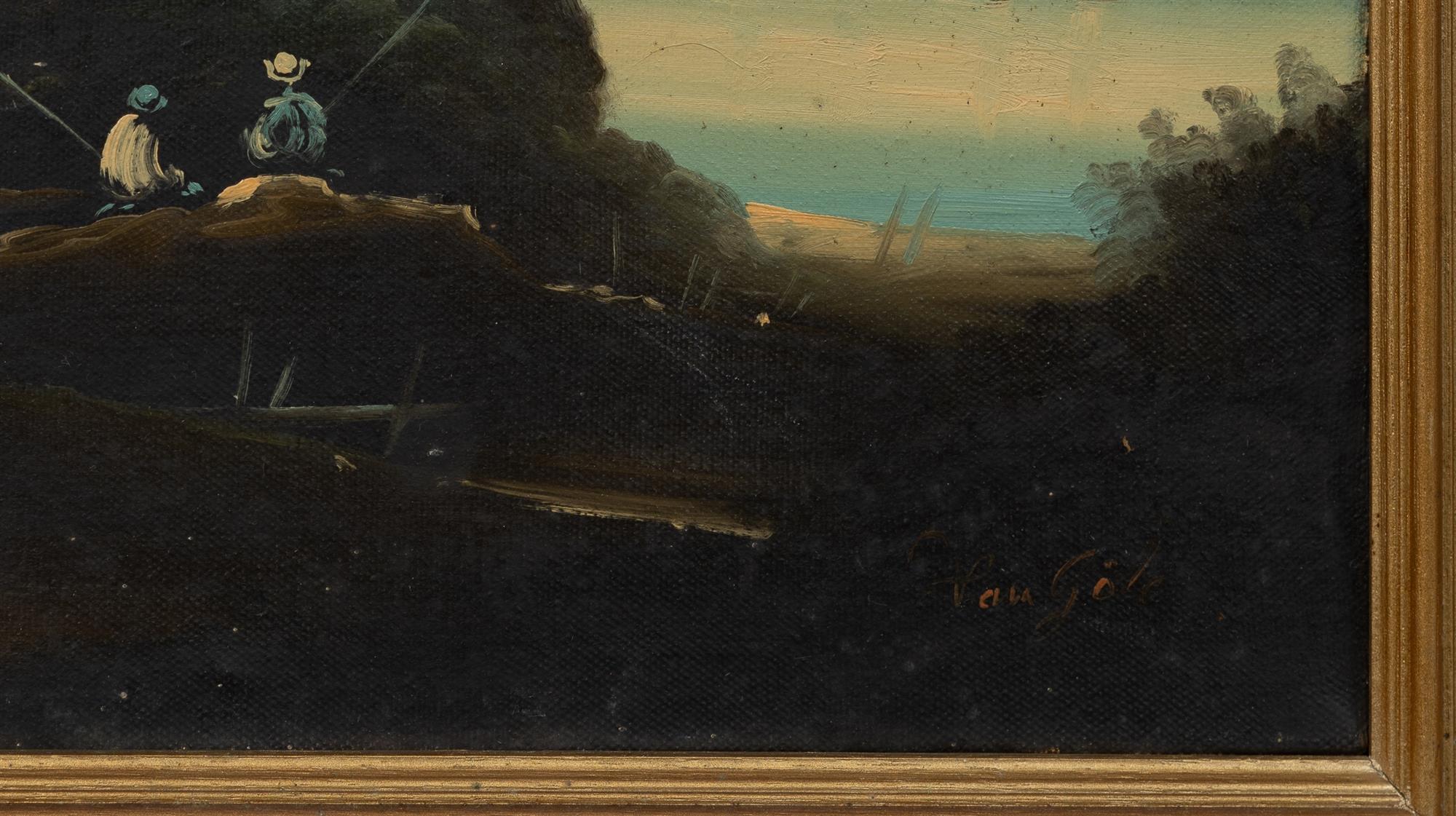 European School (3), Three European Oil Paintings Bucolic Landscape, signed Van Gold (?) (69.5x98cm); Landscape with Tree and Seated Figures, signed Van Gold (?) (60x39cm); and Santa Maria della Salute on the Grand Canal, Venice, signed indistinctly lower right (39x49cm), export stamp verso. Oil on Canvas (3)