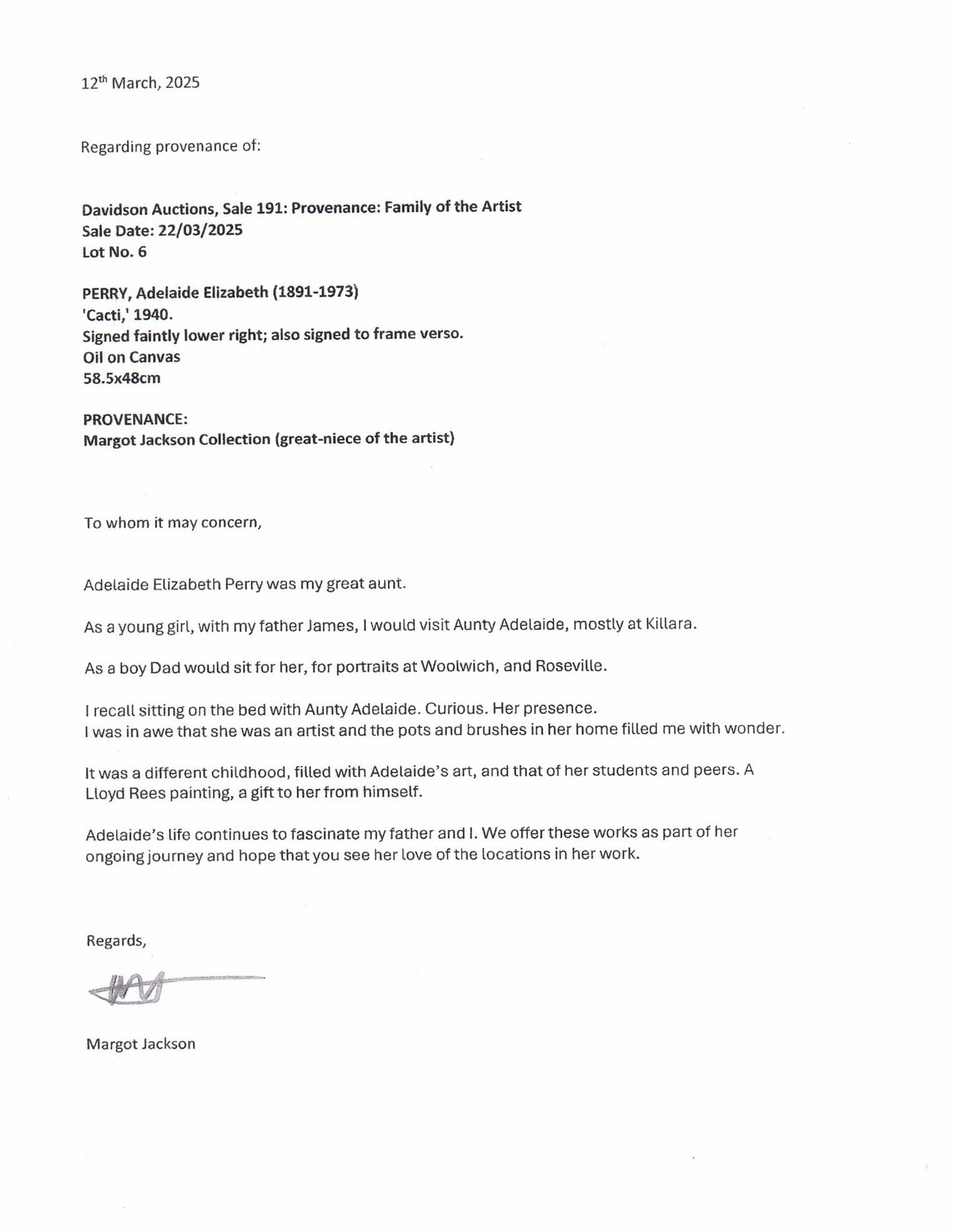 PERRY, Adelaide Elizabeth (1891-1973) 'Cacti,' 1940. Signed faintly lower right; also signed to frame verso. Oil on Canvas 58.5x48cm PROVENANCE: Margot Jackson Collection (great-niece of the artist)Estimate $1,800-3,500