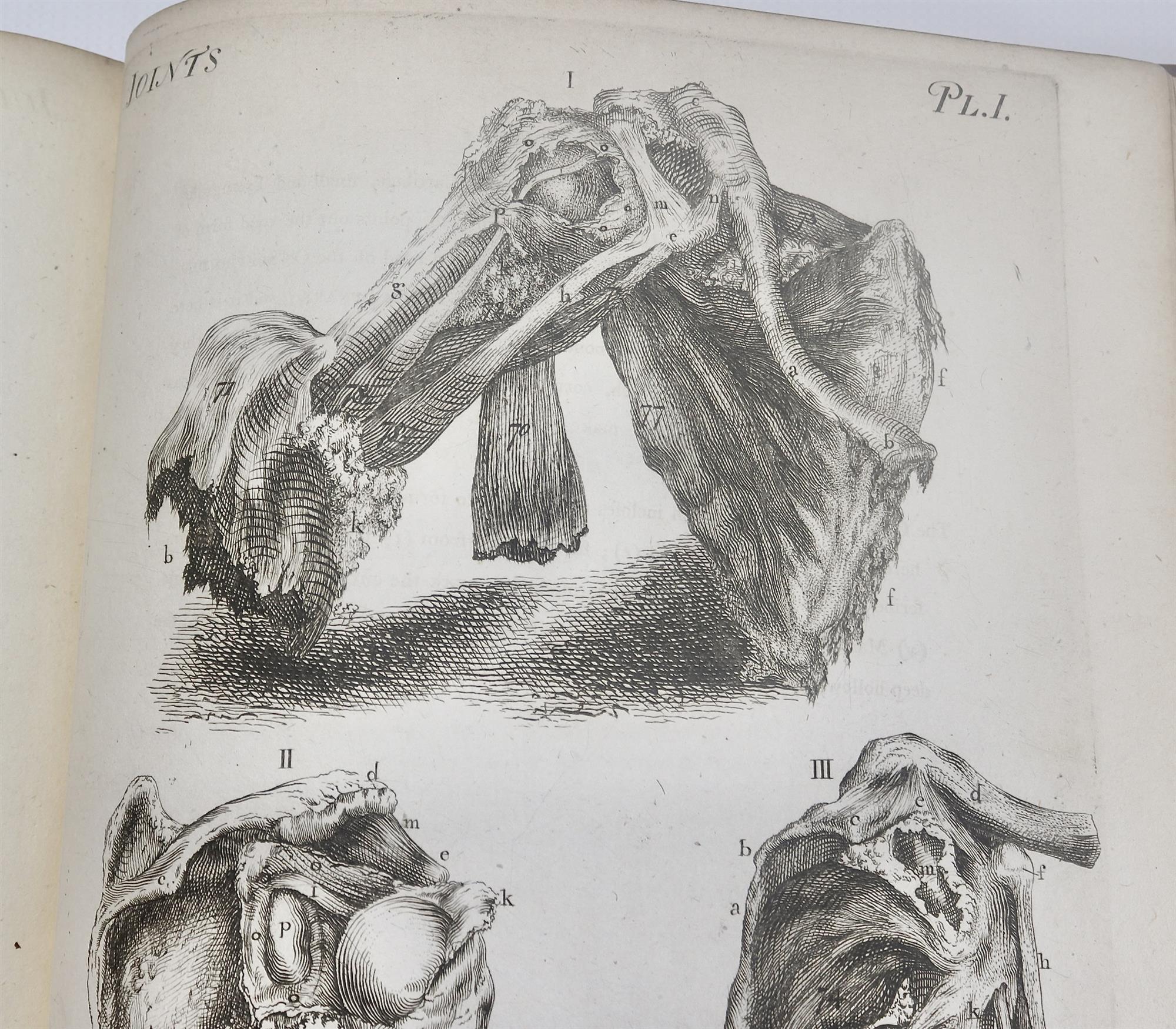 BELL, John. Engravings, Explaining the Anatomy of the Bones, Muscles and Joints. Pub. EDINBURGH: Printed by John Paterson, for Bell and Bradfute, and T. Duncan; and J. Johnson, and G.G.G. & J. Robinsons, London. M DCC XCIV. [1794]. First issue, first edition. This is the atlas of plates to accompany the text volume, but almost never found together. 'The 28 plates are magnificently realistic, all are drawn and most were etched or engraved by Bell. Seven were engraved by J. Beugo. This the first issue has an extra leaf 38*: 'Supplementary explanation to Plate V of the bones'. Copies have been noted without the printed title and a copy has been seen with two of the etchings in an early state with note unfinished signed by Bell.' (Russell, British Anatomy 60). Full comprehensive collation available on request. A significant work and scarce in this state. Later binding in half marbled leather with marbled paper boards, lightly aged. Half title and preliminaries are foxed. Text is toned to the edges, occasional finger soiling to outer margin, sparse mild foxing, overall very good for age. Refer to images. Bookplate for K.F. Russell. (265x210mm)