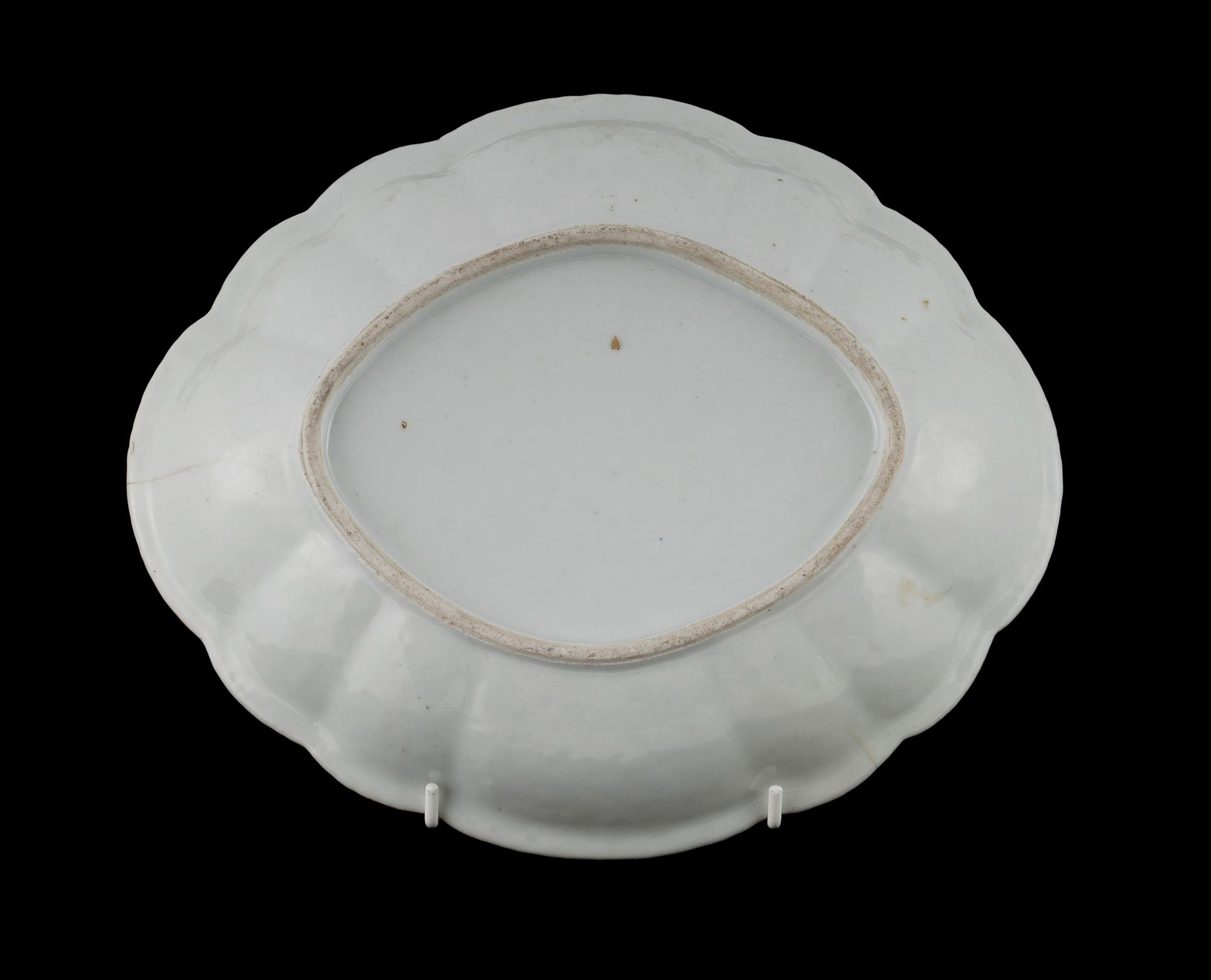 2 Cantonese Famille Rose Porcelain Plates. One circular plate with reserve panels depicting figures on a terrace and panels with flowers, birds & insects (Dia 27cm); and an oval dish with central panel depicting ladies in a courtyard (22x26cm) Estimate $100-200