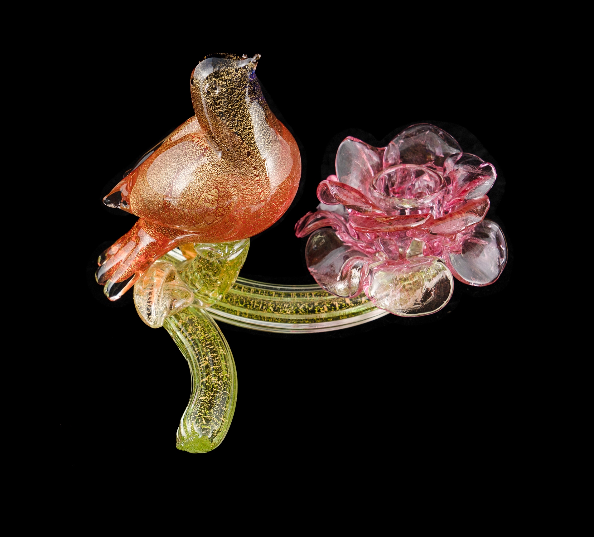 Two Murano Glass Items Large clear bubble glass handkerchief bowl; & a bird figure with aventurine. H16cm Dia 22cm (bowl) H14.5cm (bird figure) Provenance: Deceased Estate, Sydney.Estimate $100-150