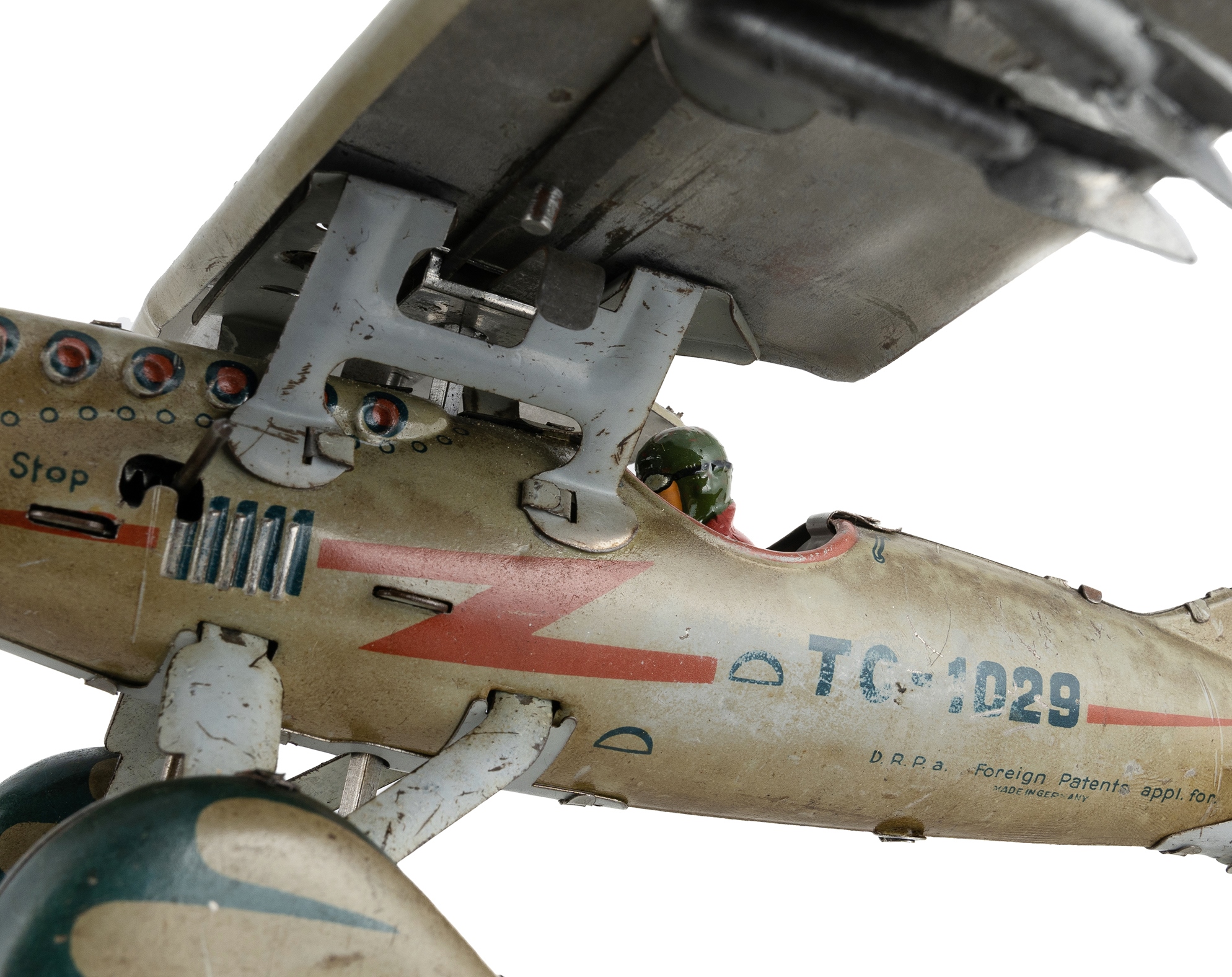 Tippco Lithographed Tinplate Aeroplane. Monoplane clockwork bomber with bomb dropping mechanism, c.1935. Some paint darkening to fuselage, otherwise good. L26cm (2Piv)Estimate $500-1,000